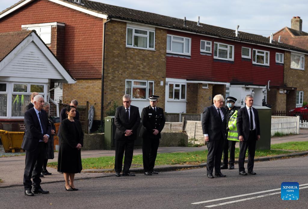 British Prime Minister Boris Johnson (3rd R) and British Labour Party leader Keir Starmer (1st R) pay tributes to Sir David Amess in Leigh-on-Sea, Essex, Britain on Oct. 16, 2021. The murder of British lawmaker David Amess was declared a terrorist incident by London's metropolitan police on Saturday. Britain's ruling Conservative Party's member of the parliament (MP) David Amess has died after being stabbed on Friday at a constituency meeting in Essex, a county in southeastern England. (Photo by Andrew Parsons/No 10 Downing Street/Handout via Xinhua)