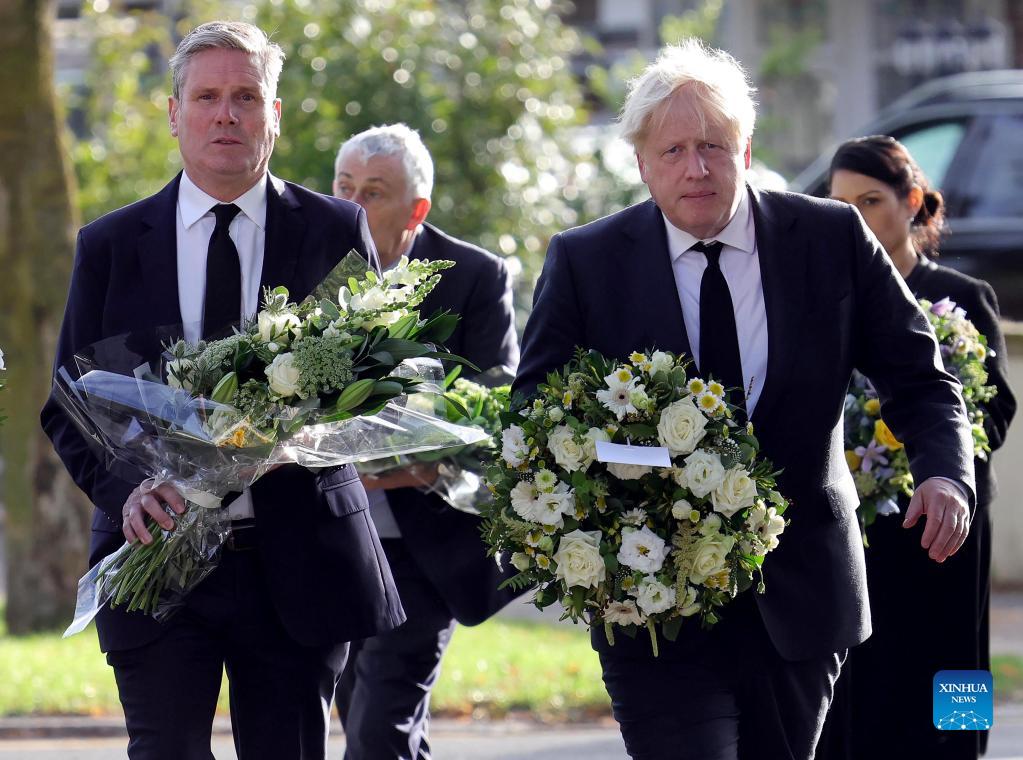 British Prime Minister Boris Johnson (R, front) and British Labour Party leader Keir Starmer (L, front) pay tributes to Sir David Amess in Leigh-on-Sea, Essex, Britain on Oct. 16, 2021. The murder of British lawmaker David Amess was declared a terrorist incident by London's metropolitan police on Saturday. Britain's ruling Conservative Party's member of the parliament (MP) David Amess has died after being stabbed on Friday at a constituency meeting in Essex, a county in southeastern England. (Photo by Andrew Parsons/No 10 Downing Street/Handout via Xinhua)
