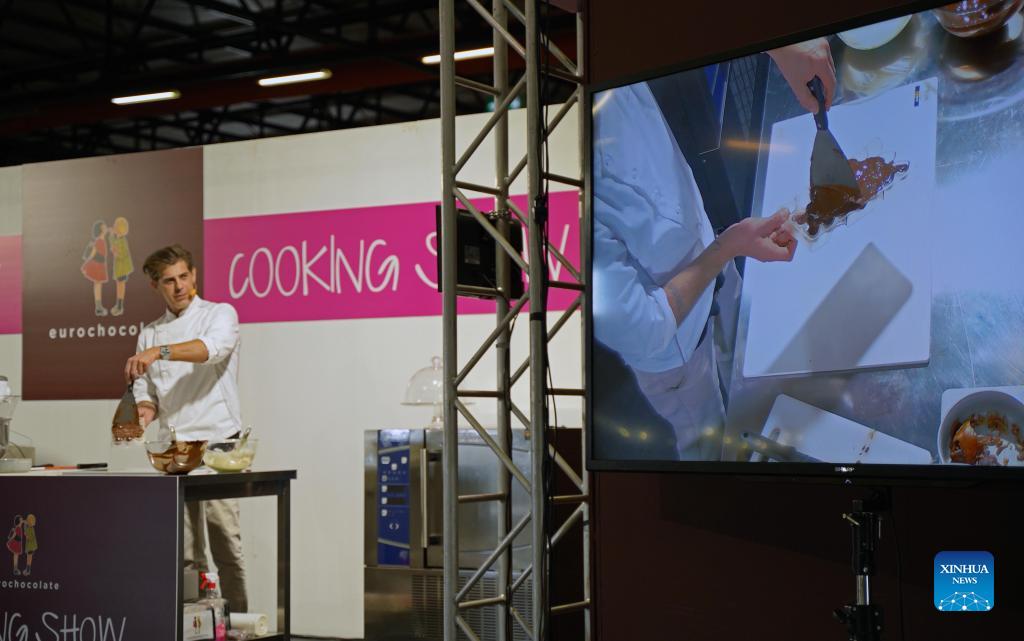 A confectioner makes chocolate during the Eurochocolate in Perugia, Italy, on Oct. 15, 2021. The 27th international chocolate festival Eurochocolate kicked off on Friday in Perugia, an Italian city with a tradition of chocolate production. (Xinhua/Jin Mamengni)