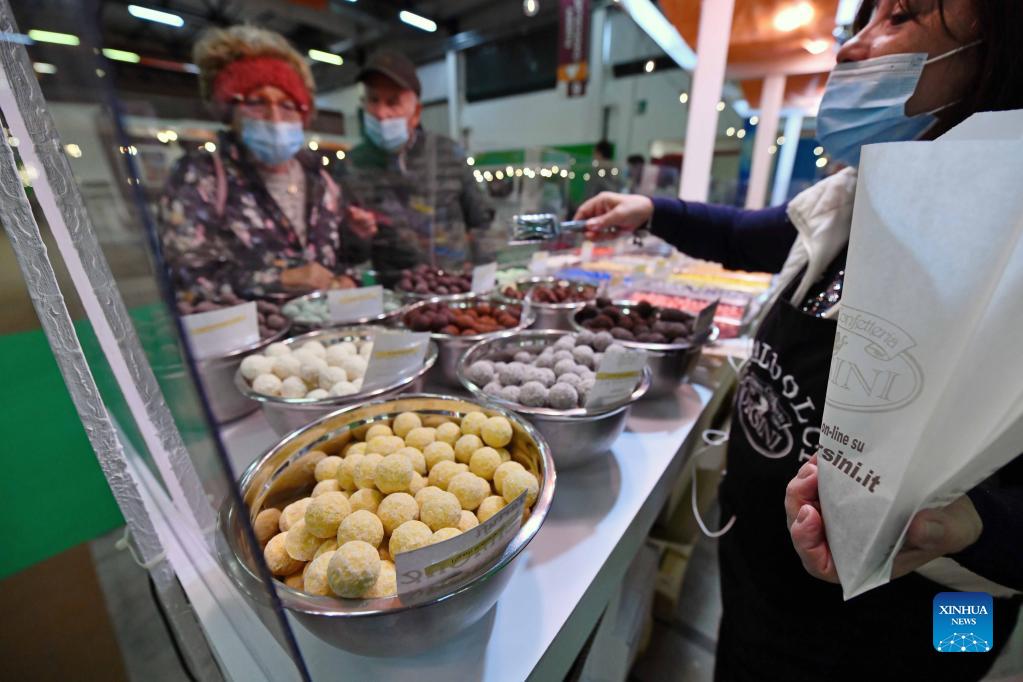 People shop for chocolate products during the Eurochocolate in Perugia, Italy, on Oct. 15, 2021. The 27th international chocolate festival Eurochocolate kicked off on Friday in Perugia, an Italian city with a tradition of chocolate production. (Xinhua/Jin Mamengni)