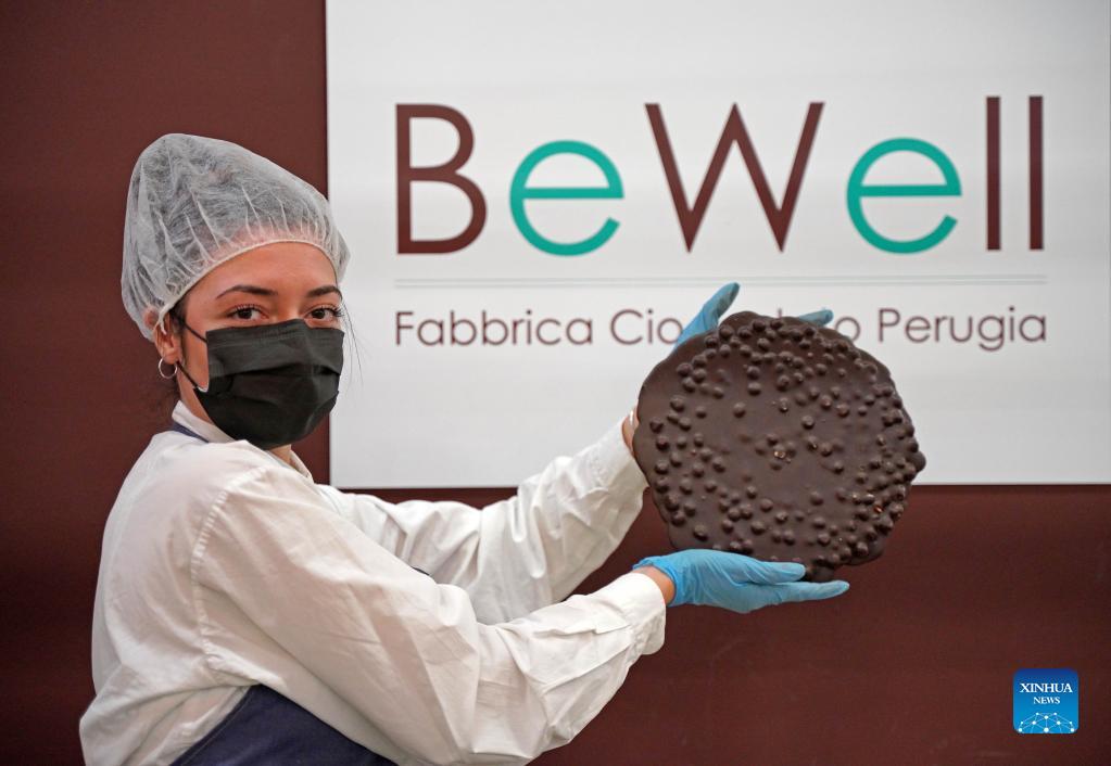 An exhibitor displays a large piece of chocolate during the Eurochocolate in Perugia, Italy, on Oct. 15, 2021. The 27th international chocolate festival Eurochocolate kicked off on Friday in Perugia, an Italian city with a tradition of chocolate production. (Xinhua/Jin Mamengni)
