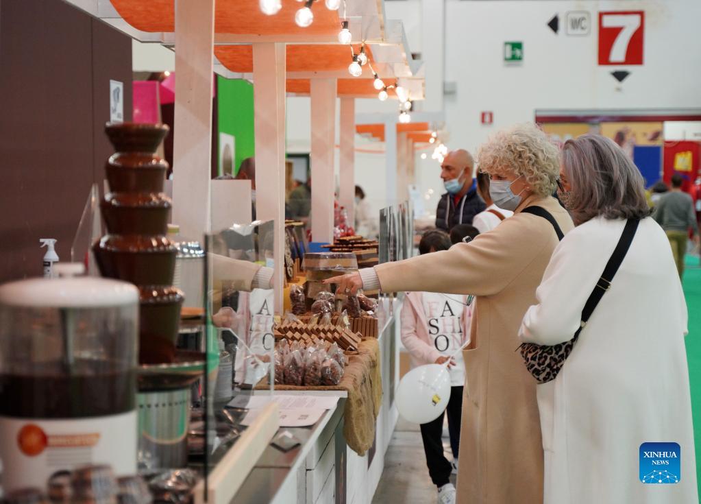 People shop for chocolate products during the Eurochocolate in Perugia, Italy, on Oct. 15, 2021. The 27th international chocolate festival Eurochocolate kicked off on Friday in Perugia, an Italian city with a tradition of chocolate production. (Xinhua/Jin Mamengni)