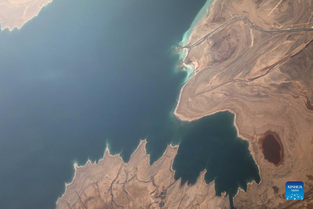 Aerial photo taken on Oct.15, 2021 shows the shores of the southern part of the Dead Sea near Masada National Park, Israel. (Photo by Gil Cohen Magen/Xinhua)