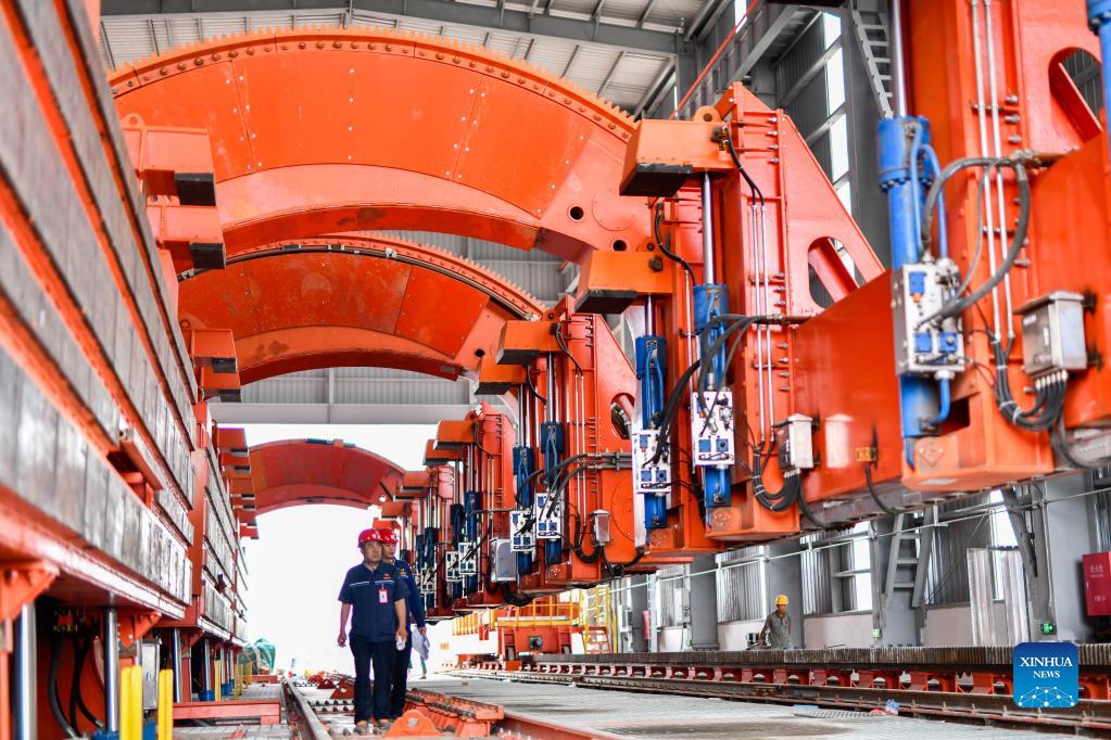 Engineers check equipment at the construction site of a "road-to-rail" project in Qian'an Ctiy, north China's Hebei Province, Sept. 16, 2021. Qian'an in Hebei Province is a major county in steelmaking industry in north China, with a large transportation demand for raw materials such as iron ore, coal and coke. In order to reduce pollution and traffic congestion caused by road transportation of bulk goods, special railway lines for key iron and steel enterprises have been built under a "road-to-rail" scheme, which paved the way for a greener and more efficient logistics channel for local steelmaking. Since 2019, Qian'an has invested more than 311 million U.S. Dollars and built five dedicated railway lines based on the existing three railways, with a total mileage of 45.58 km and an annual transport capacity of 60 million tonnes. Under the "road-to-rail" scheme, supply of raw materials is ensured, logistics costs are reduced, while market competitiveness increases. The city's ecosystem has also benefited from the scheme. In 2020, air quality in Qian'an improved substantially, as road transportation volume dropped by 26 million tonnes. (Xinhua/Mu Yu)