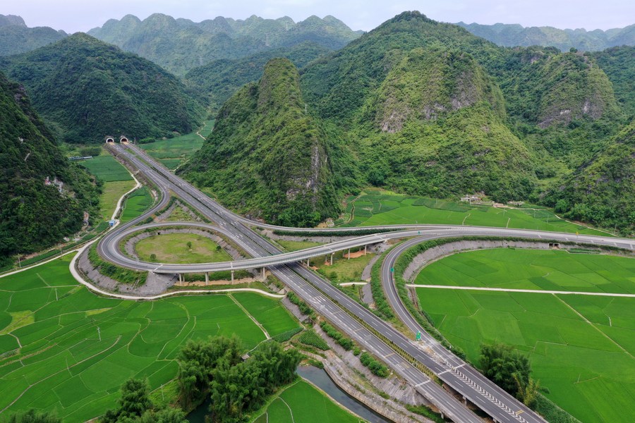 Aerial photo taken on May 8, 2021 shows the scenery of a highway in Donglan County, south China's Guangxi Zhuang Autonomous Region. (Xinhua/Lu Boan)