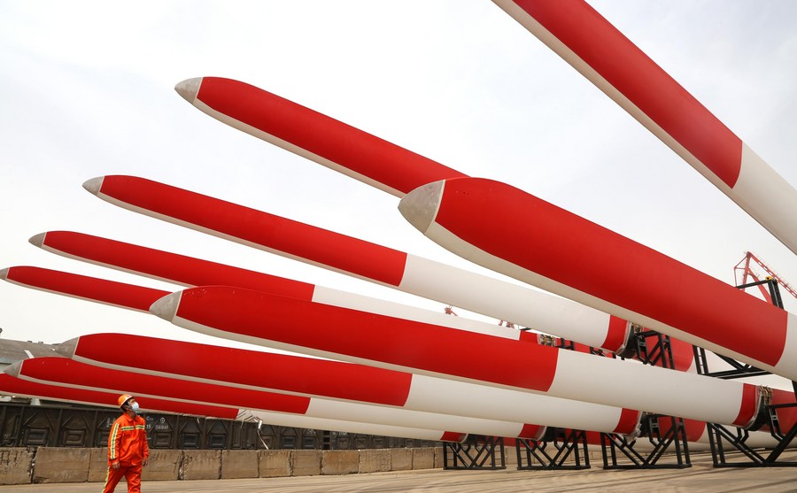 Wind turbine blades await shipping at Lianyungang Port, east China's Jiangsu province, April 16, 2021. (Photo by Wang Chun/Xinhua)
