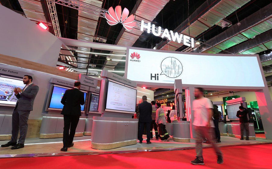 Photo taken on Nov. 7, 2021 shows Huawei's booth during the 25th Cairo International Information and Communications Technology Exhibition and Conference in Cairo, Egypt.(Xinhua/Wang Dongzhen)