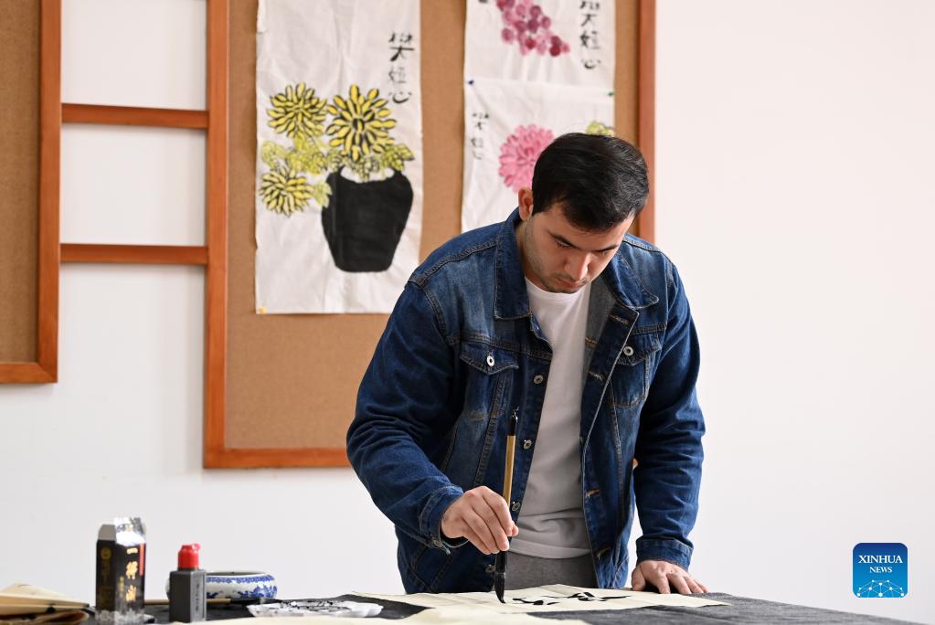 Nozimov Sharifkhuja practices calligraphy in a classroom in Nankai University in north China's Tianjin, Nov. 15, 2021. Tajik Nozimov Sharifkhuja calls himself a Chinese culture "addict." He has lived in China for over four years, spending his time on learning Chinese language. Nozimov, 24, is a postgraduate student at College of Chinese Language and Culture of Nankai University, a prestigious university in north China's Tianjin Municipality. In his childhood, his encounters with Chinese Kung Fu (Chinese martial arts) movies inspired him to study Chinese in the following years. Nozimov's strong curiosity about China and Chinese culture prompted him to travel to the city of Dalian in northeast China's Liaoning Province in 2017, with the hope of learning about what the real China was like. His excellent Chinese proficiency won him many accolades in Chinese contests, including a champion of Chinese speech contest for international students held last month in Henan Province. "I really enjoy the charm of Chinese culture and hope to bring it to my motherland," he said. (Xinhua/Li Ran)