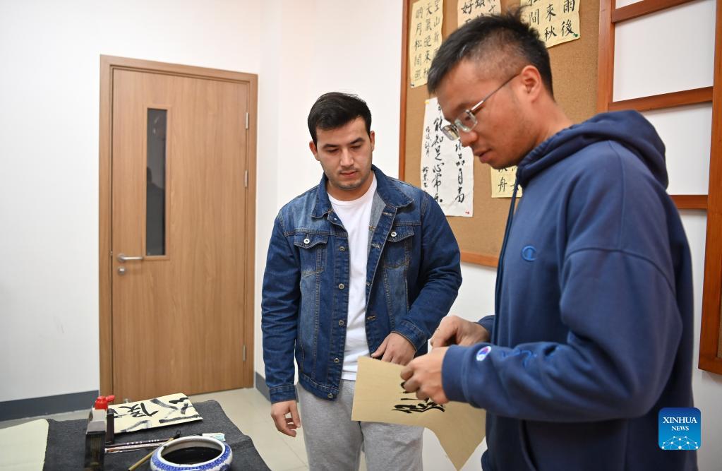 Nozimov Sharifkhuja (L) learns from a teacher the methods of folding Xuan paper, a delicate, long-lasting type of paper traditionally used for Chinese calligraphy and painting, in a calligraphy classroom in Nankai University in north China's Tianjin, Nov. 15, 2021. Tajik Nozimov Sharifkhuja calls himself a Chinese culture "addict." He has lived in China for over four years, spending his time on learning Chinese language. Nozimov, 24, is a postgraduate student at College of Chinese Language and Culture of Nankai University, a prestigious university in north China's Tianjin Municipality. In his childhood, his encounters with Chinese Kung Fu (Chinese martial arts) movies inspired him to study Chinese in the following years. Nozimov's strong curiosity about China and Chinese culture prompted him to travel to the city of Dalian in northeast China's Liaoning Province in 2017, with the hope of learning about what the real China was like. His excellent Chinese proficiency won him many accolades in Chinese contests, including a champion of Chinese speech contest for international students held last month in Henan Province. "I really enjoy the charm of Chinese culture and hope to bring it to my motherland," he said. (Xinhua/Li Ran)