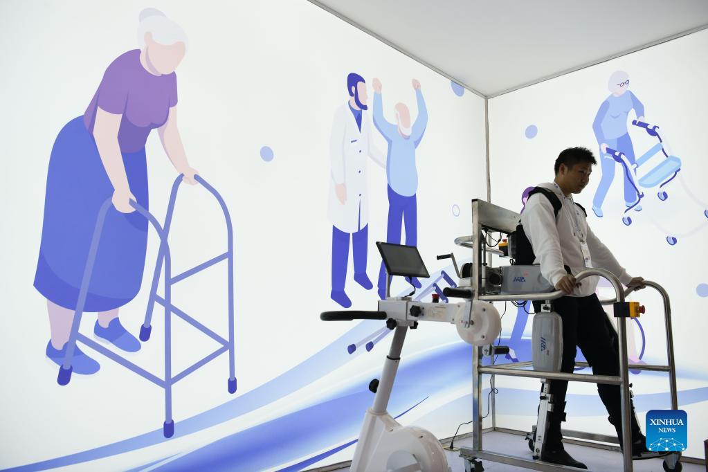 A staff member displays a walking training device at the fourth World Manufacturing Convention in Hefei, east China's Anhui Province, Nov. 19, 2021. The fourth World Manufacturing Convention kicked off Friday in Hefei, capital of east China's Anhui Province. The four-day event, themed "innovation-driven, digitally empowered: global manufacturing industry aligned for high-quality growth," aims to promote high-quality manufacturing and deepen exchanges between China and the rest of the world. (Xinhua/Zhang Duan)