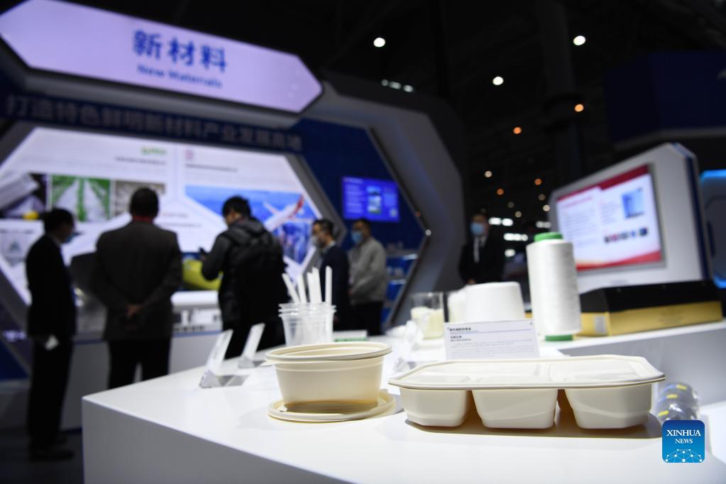 Photo taken on Nov. 19, 2021 shows meal boxes made of polylactide heat resistant material at the fourth World Manufacturing Convention in Hefei, east China's Anhui Province. The fourth World Manufacturing Convention kicked off Friday in Hefei, capital of east China's Anhui Province. The four-day event, themed "innovation-driven, digitally empowered: global manufacturing industry aligned for high-quality growth," aims to promote high-quality manufacturing and deepen exchanges between China and the rest of the world. (Xinhua/Zhang Duan)