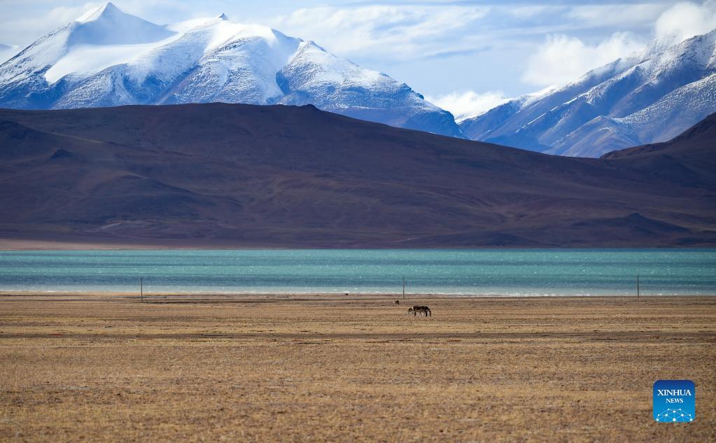 Photo taken on Sept. 24, 2021 shows Tibetan wild donkeys foraging by a lake on the Changtang Plateau, in southwest China's Tibet Autonomous Region. Changtang Plateau, as a key area of inland lakes in China, has a total lake area of over 25,000 square kilometers. It is also known by people for the number and high altitude of lakes. According to statistical data, there are nearly 500 lakes with an area of over one square kilometers and more than 300 lakes with an area of over five square kilometers. Some famous lakes on the plateau include Nam Co Lake, Serling Tso Lake and Zhari Namco Lake, to name a few. (Xinhua/Jigme Dorje)