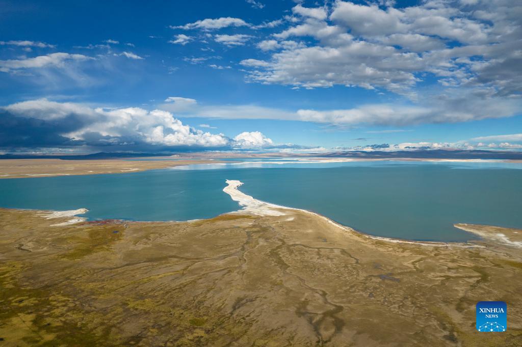 Aerial photo taken on Sept. 25, 2021 shows a lake on the Changtang Plateau, in southwest China's Tibet Autonomous Region. Changtang Plateau, as a key area of inland lakes in China, has a total lake area of over 25,000 square kilometers. It is also known by people for the number and high altitude of lakes. According to statistical data, there are nearly 500 lakes with an area of over one square kilometers and more than 300 lakes with an area of over five square kilometers. Some famous lakes on the plateau include Nam Co Lake, Serling Tso Lake and Zhari Namco Lake, to name a few. (Xinhua/Sun Ruibo)