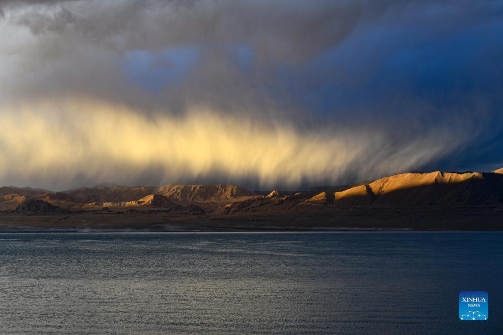 Photo taken on Sept. 22, 2021 shows a view of a lake and mountains on the Changtang Plateau, in southwest China's Tibet Autonomous Region. Changtang Plateau, as a key area of inland lakes in China, has a total lake area of over 25,000 square kilometers. It is also known by people for the number and high altitude of lakes. According to statistical data, there are nearly 500 lakes with an area of over one square kilometers and more than 300 lakes with an area of over five square kilometers. Some famous lakes on the plateau include Nam Co Lake, Serling Tso Lake and Zhari Namco Lake, to name a few. (Xinhua/Jigme Dorje)