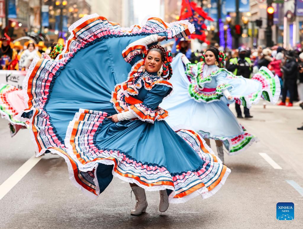 Performers dance during the Chicago Thanksgiving Parade in downtown Chicago, the United States, on Nov. 25, 2021. (Photo by Joel Lerner/Xinhua)