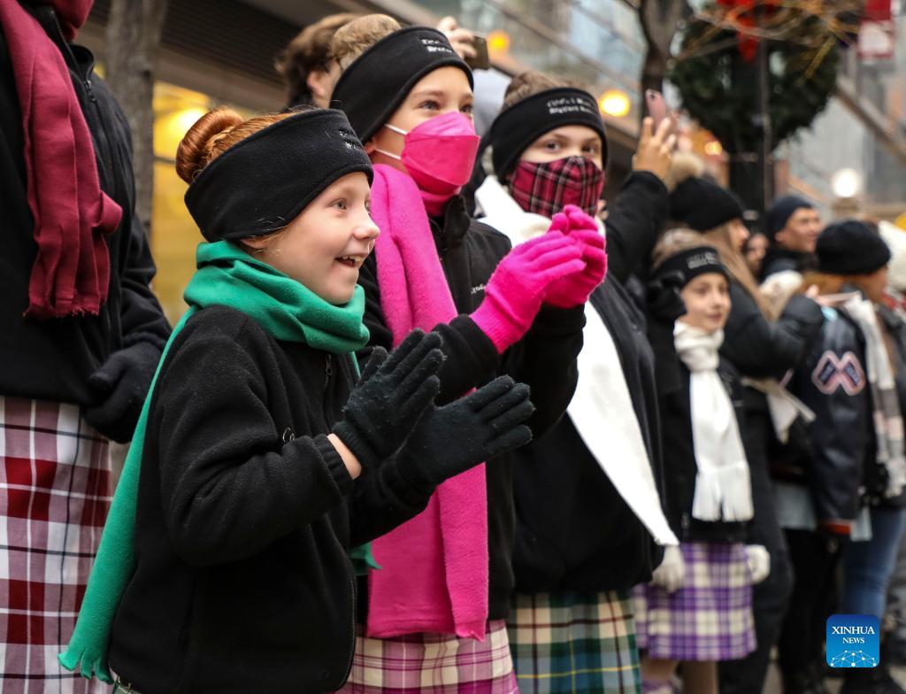Spectators react during the Chicago Thanksgiving Parade in downtown Chicago, the United States, on Nov. 25, 2021. (Photo by Joel Lerner/Xinhua)