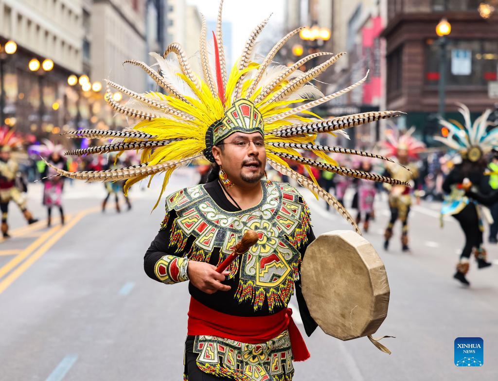 A man performs during the Chicago Thanksgiving Parade in downtown Chicago, the United States, on Nov. 25, 2021. (Photo by Joel Lerner/Xinhua)