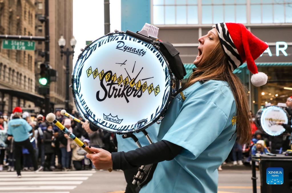 A drummer performs during the Chicago Thanksgiving Parade in downtown Chicago, the United States, on Nov. 25, 2021. (Photo by Joel Lerner/Xinhua)