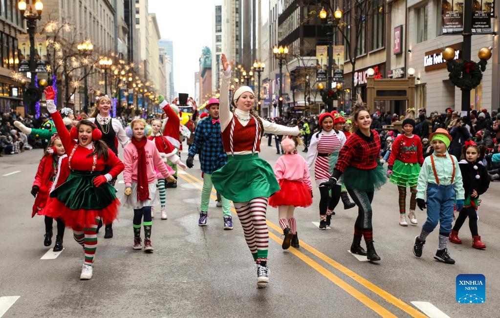 Performers dance during the Chicago Thanksgiving Parade in downtown Chicago, the United States, on Nov. 25, 2021. (Photo by Joel Lerner/Xinhua)