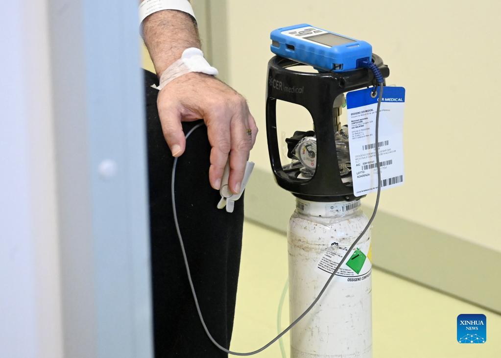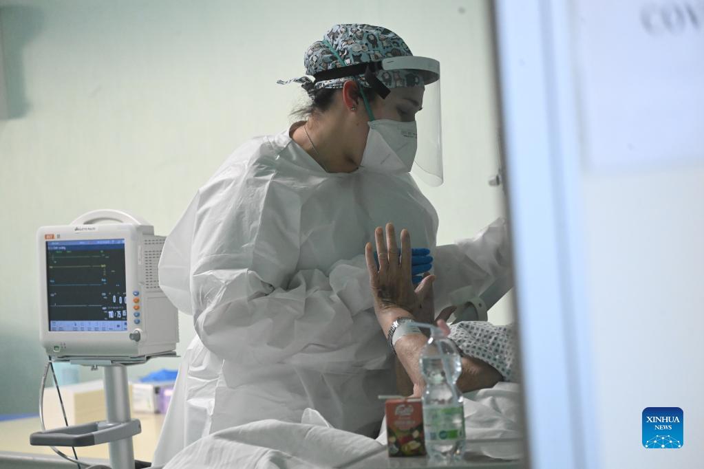A patient is seen in a COVID-19 unit at a hospital in Bologna, Italy, on Dec. 3, 2021. Coronavirus infection rates in Italy are on the rise. Italy reported 17,030 new COVID-19 cases on Friday, bringing the total number of confirmed COVID-19 cases to 5,077,445, according to the latest data from the Ministry of Health. (Photo by Gianni Schicchi/Xinhua)