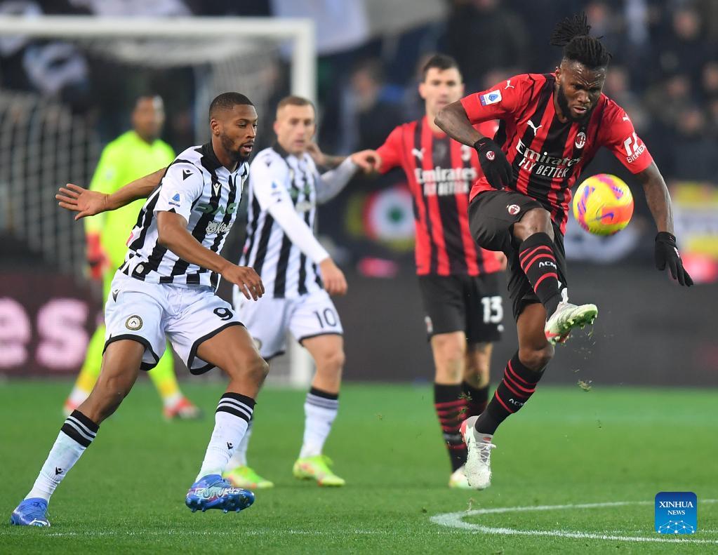 AC Milan's Frank Kessie (R) vies with Udinese's Beto during a Serie A soccer match between Udinese and AC Milan in Udine, Italy, Dec. 11, 2021. (Str/Xinhua)