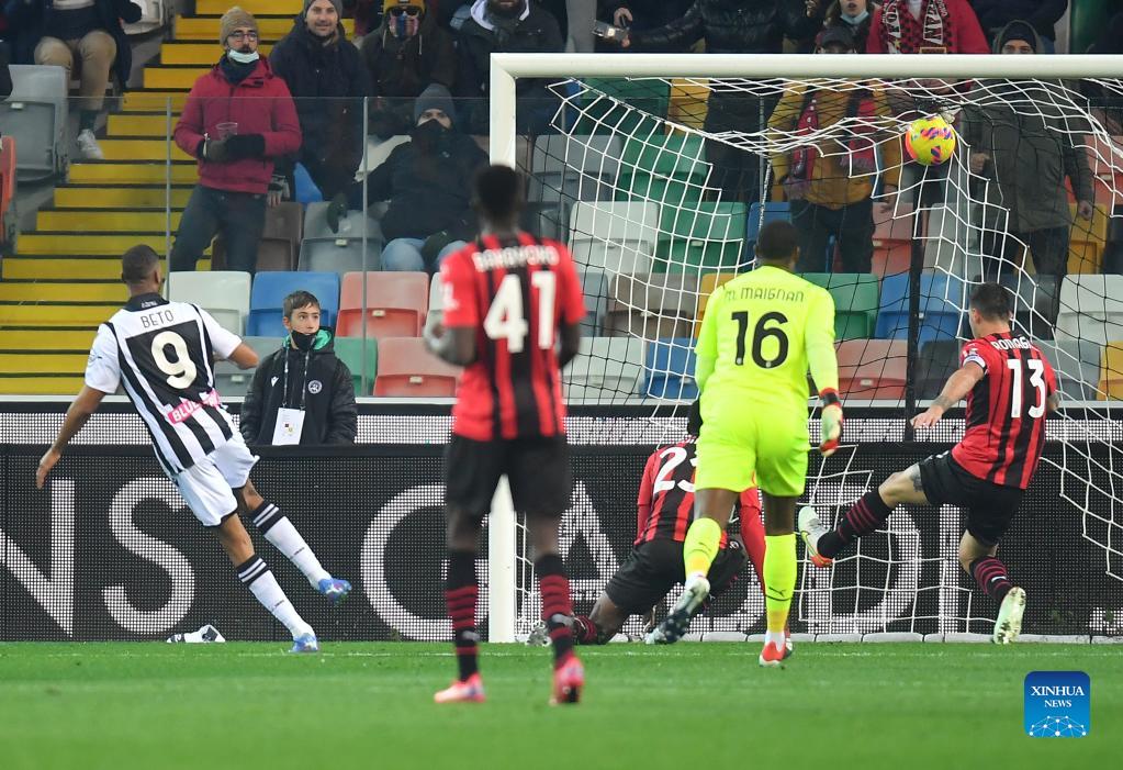 Udinese's Beto (1st L) scores his goal during a Serie A soccer match between Udinese and AC Milan in Udine, Italy, Dec. 11, 2021. (Str/Xinhua)