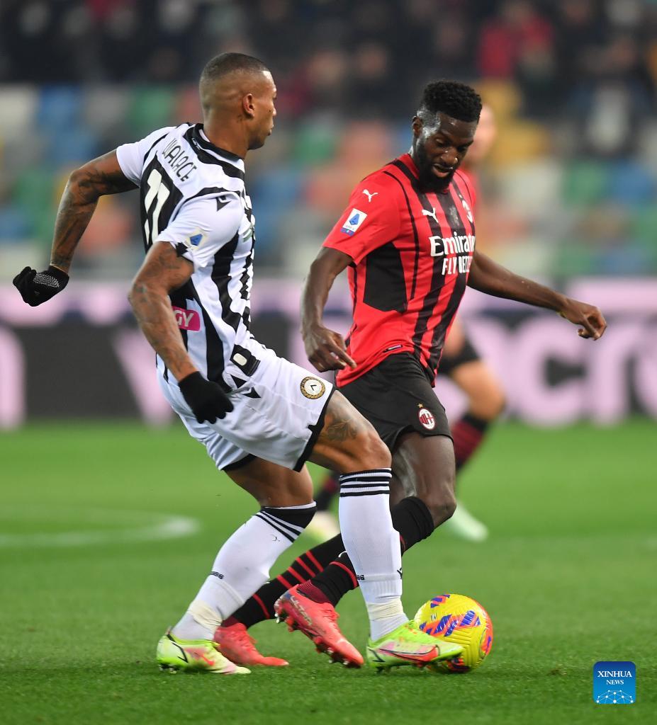 AC Milan's Tiemoue Bakayoko (R) vies with Udinese's Walace during a Serie A soccer match between Udinese and AC Milan in Udine, Italy, Dec. 11, 2021. (Str/Xinhua)