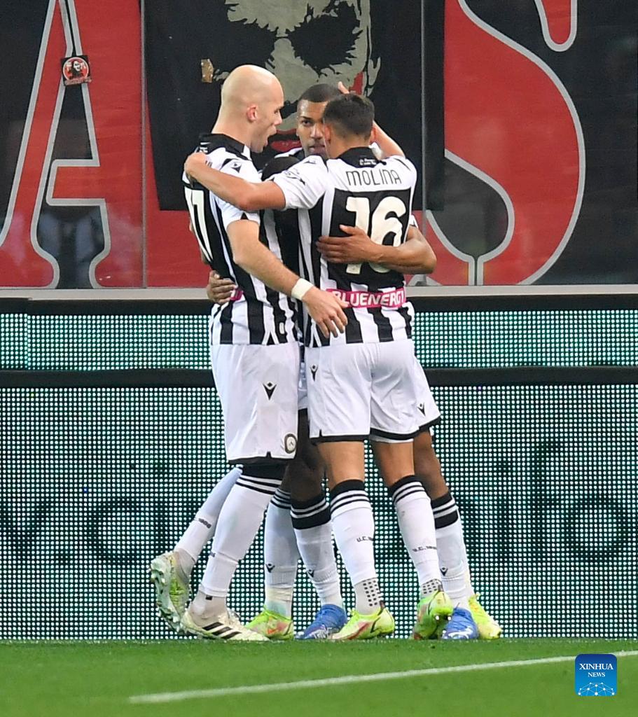 Udinese's Beto (C) celebrates his goal with his teammates during a Serie A soccer match between Udinese and AC Milan in Udine, Italy, Dec. 11, 2021. (Str/Xinhua)