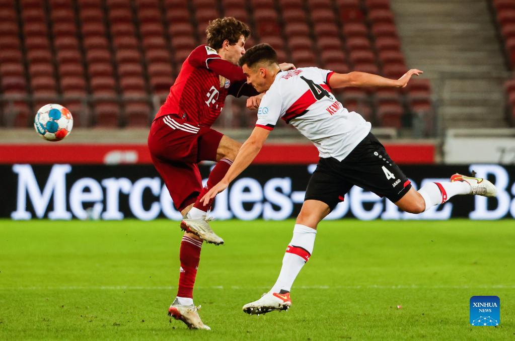 Thomas Mueller (L) of Bayern Munich vies with Marc Oliver Kempf of Stuttgart during a German Bundesliga match between VfB Stuttgart and Bayern Munich in Stuttgart, Germany, on Dec. 14, 2021. Bayern Munich won 5-0. (Photo by Philippe Ruiz/Xinhua)