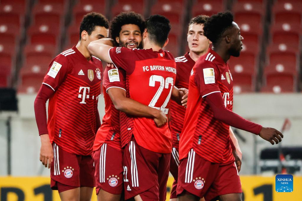 Serge Gnabry (2nd L) of Bayern Munich celebrates his hat trick with teammates during a German Bundesliga match between VfB Stuttgart and Bayern Munich in Stuttgart, Germany, on Dec. 14, 2021. Bayern Munich won 5-0. (Photo by Philippe Ruiz/Xinhua)
