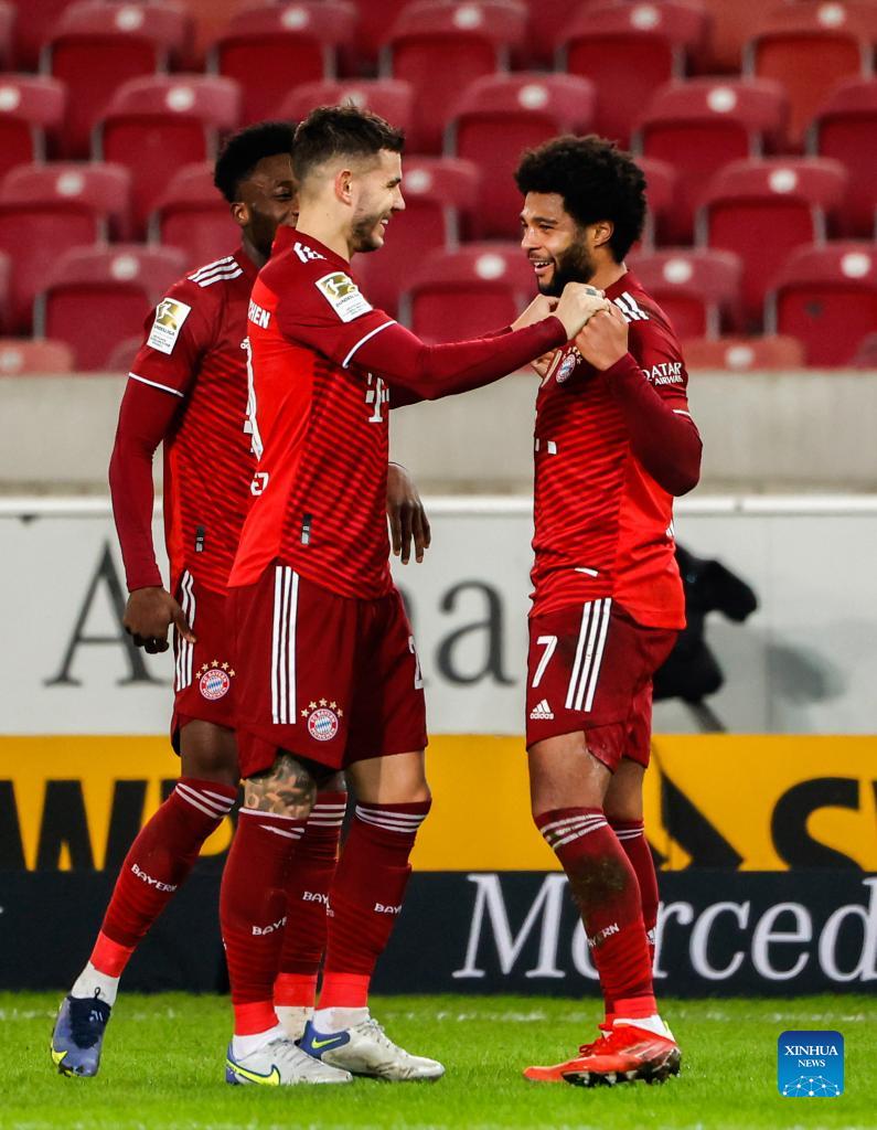 Serge Gnabry (R) of Bayern Munich celebrates his first scoring with Lucas Hernandez (C) during a German Bundesliga match between VfB Stuttgart and Bayern Munich in Stuttgart, Germany, on Dec. 14, 2021. Bayern Munich won 5-0. (Photo by Philippe Ruiz/Xinhua)