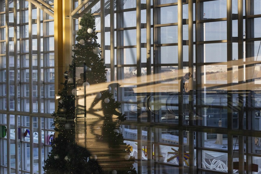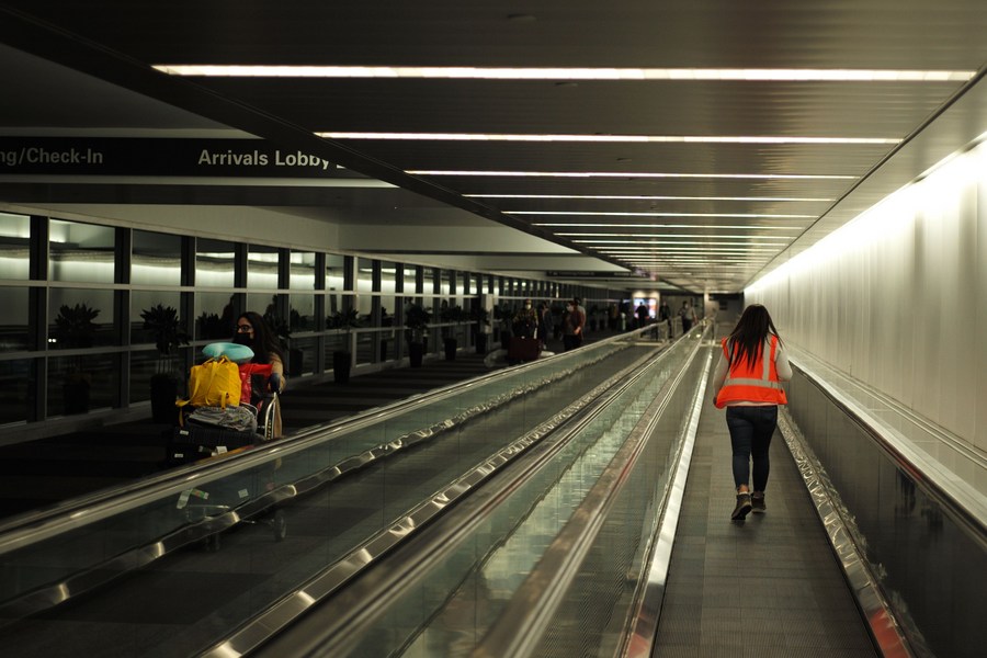 Photo taken on Dec. 4, 2021 shows a passenger wearing a face mask taking the escalator at Ronald Reagan Washington National Airport in Arlington, Virginia, the United States. (Photo by Aaron Schwartz/Xinhua)