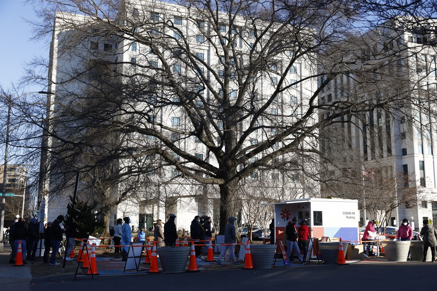 Photo taken on Dec. 22, 2021 shows people lining up to receive COVID-19 test in Arlington, Virginia, the United States. (Photo by Ting Shen/Xinhua)