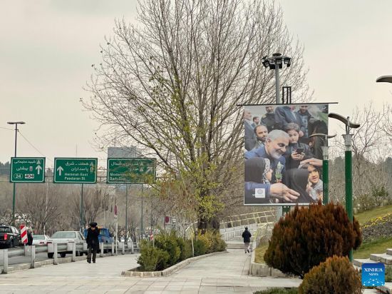People walk past a billboard showing late Iranian General Qassem Soleimani in Tehran, Iran, on Jan. 2, 2022, one day ahead of the second anniversary of his assassination by the United States in Iraq. Iran's Foreign Ministry said on Sunday that the U.S. assassination of the country's top general two years ago has raised "hatred" in global opinion. A U.S. airstrike on Jan. 3, 2020 killed Soleimani, former commander of the Quds Force of Iran's Islamic Revolution Guards Corps, along with an Iraqi militia commander, near the Baghdad International Airport. (Xinhua/Gao Wencheng)