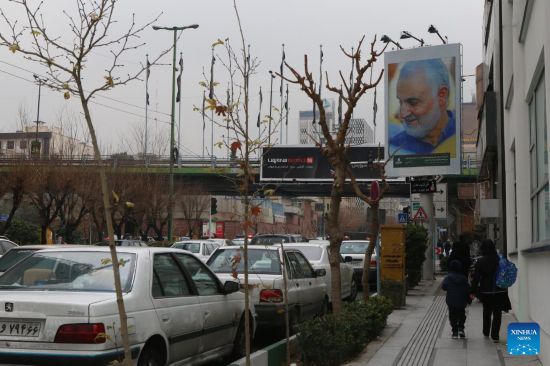 People walk past a billboard showing late Iranian General Qassem Soleimani in Tehran, Iran, on Jan. 2, 2022, one day ahead of the second anniversary of his assassination by the United States in Iraq. Iran's Foreign Ministry said on Sunday that the U.S. assassination of the country's top general two years ago has raised "hatred" in global opinion. A U.S. airstrike on Jan. 3, 2020 killed Soleimani, former commander of the Quds Force of Iran's Islamic Revolution Guards Corps, along with an Iraqi militia commander, near the Baghdad International Airport. (Xinhua/Gao Wencheng)