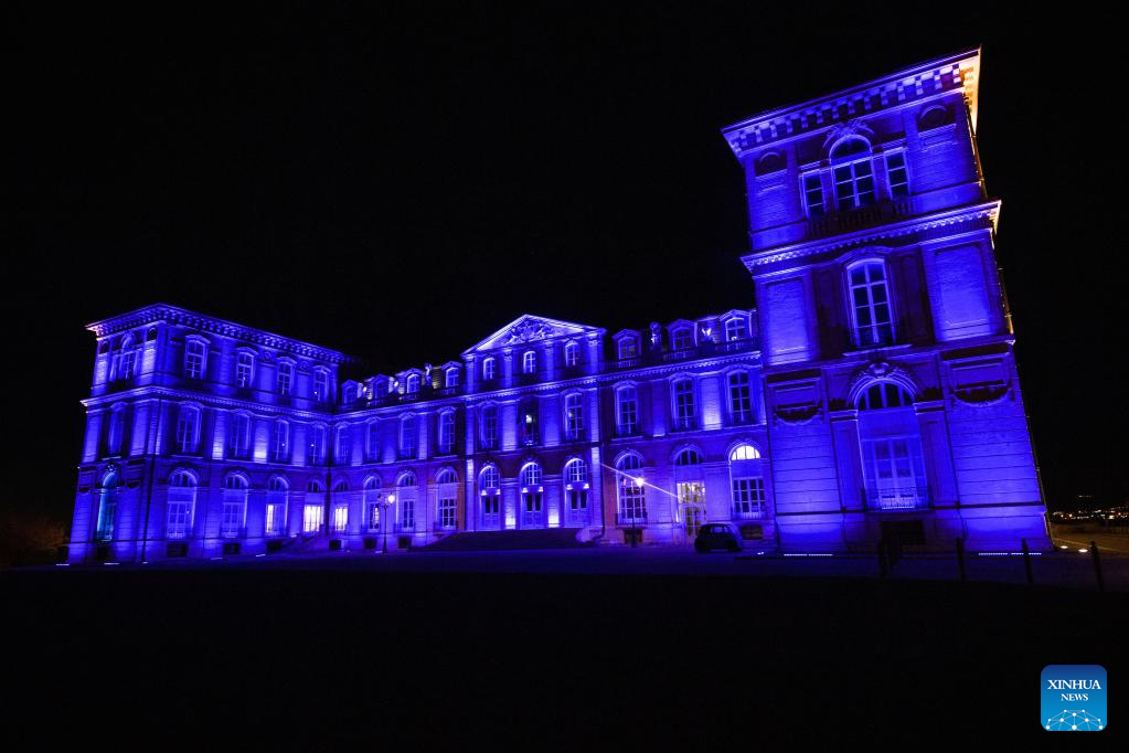 The Pharo Palace is lit up in blue to mark the start of France's six-month presidency of the European Union in Marseille, France, Jan. 6, 2022. (Photo by Clement Mahoudeau/Xinhua)