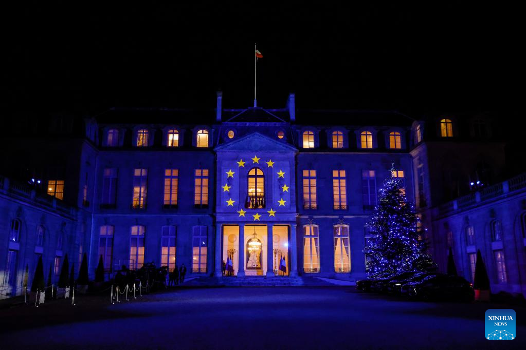 The Elysee Palace is lit up in blue to mark the start of France's six-month presidency of the European Union in Paris, France, Jan. 6, 2022. (Photo by Rit Heise/Xinhua)