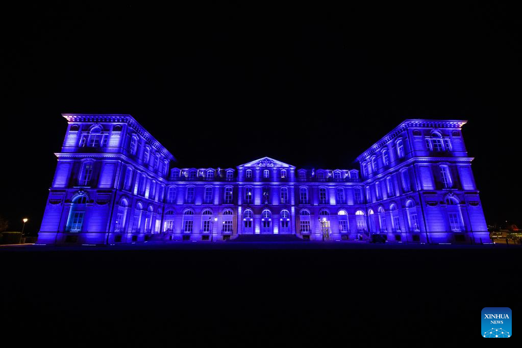 The Pharo Palace is lit up in blue to mark the start of France's six-month presidency of the European Union in Marseille, France, Jan. 6, 2022. (Photo by Clement Mahoudeau/Xinhua)