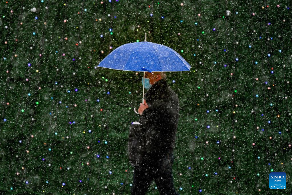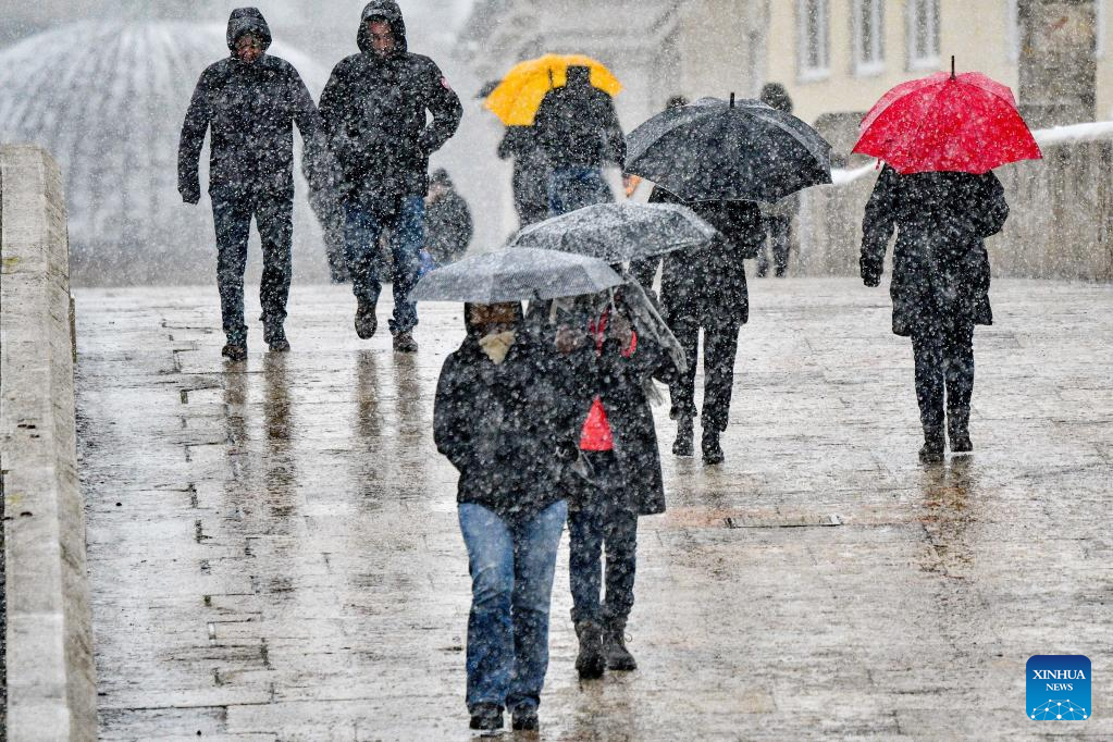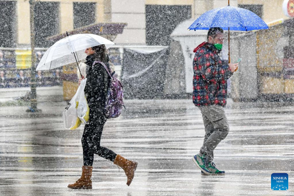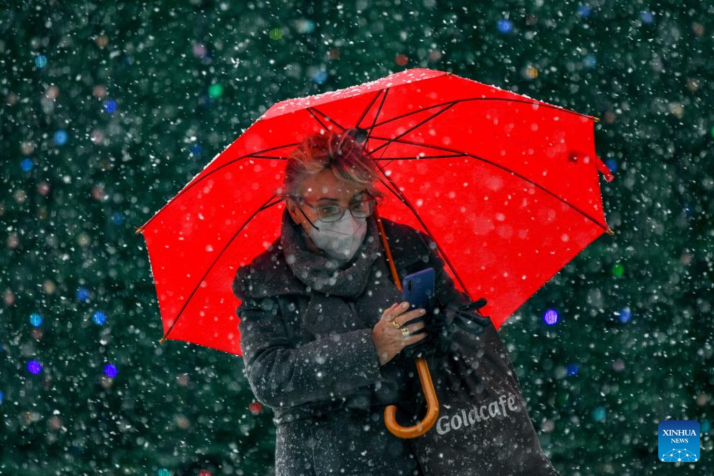 People walk amid snow in Skopje, North Macedonia on Jan. 10, 2022. (Photo by Tomislav Georgiev/Xinhua)