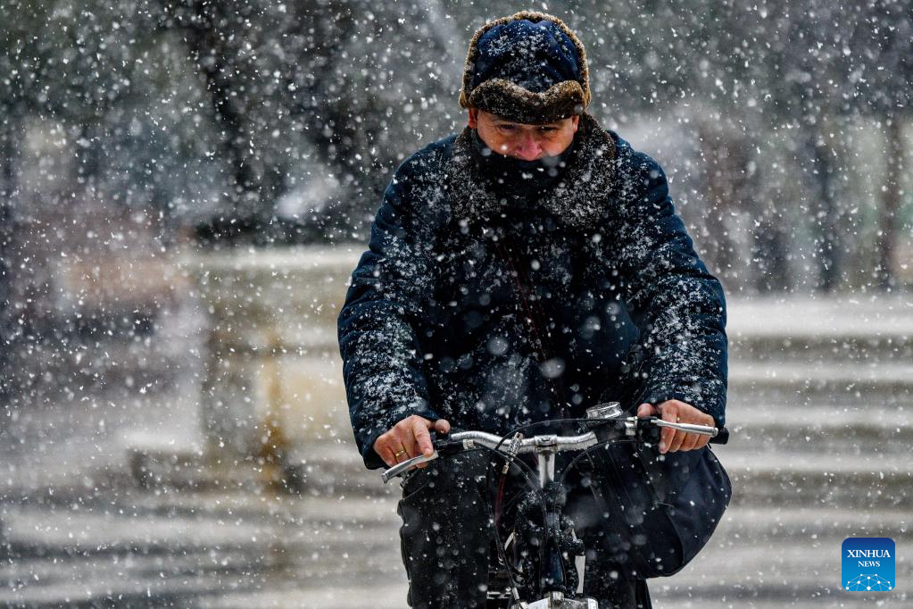 A person rides amid snow in Skopje, North Macedonia on Jan. 10, 2022. (Photo by Tomislav Georgiev/Xinhua)