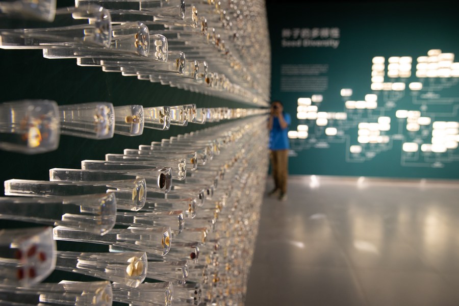 Photo taken on Oct. 10, 2021 shows a wall showcasing seed diversity during an exhibition held by the Chinese Academy of Sciences (CAS) in Kunming, southwest China's Yunnan Province. (Xinhua/Jin Liwang)