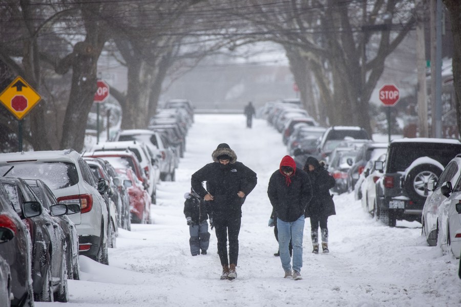 Pedestrians walk on a snowy street in New York, the United States, Jan. 29, 2022. (Photo by Winston Zhou/Xinhua)