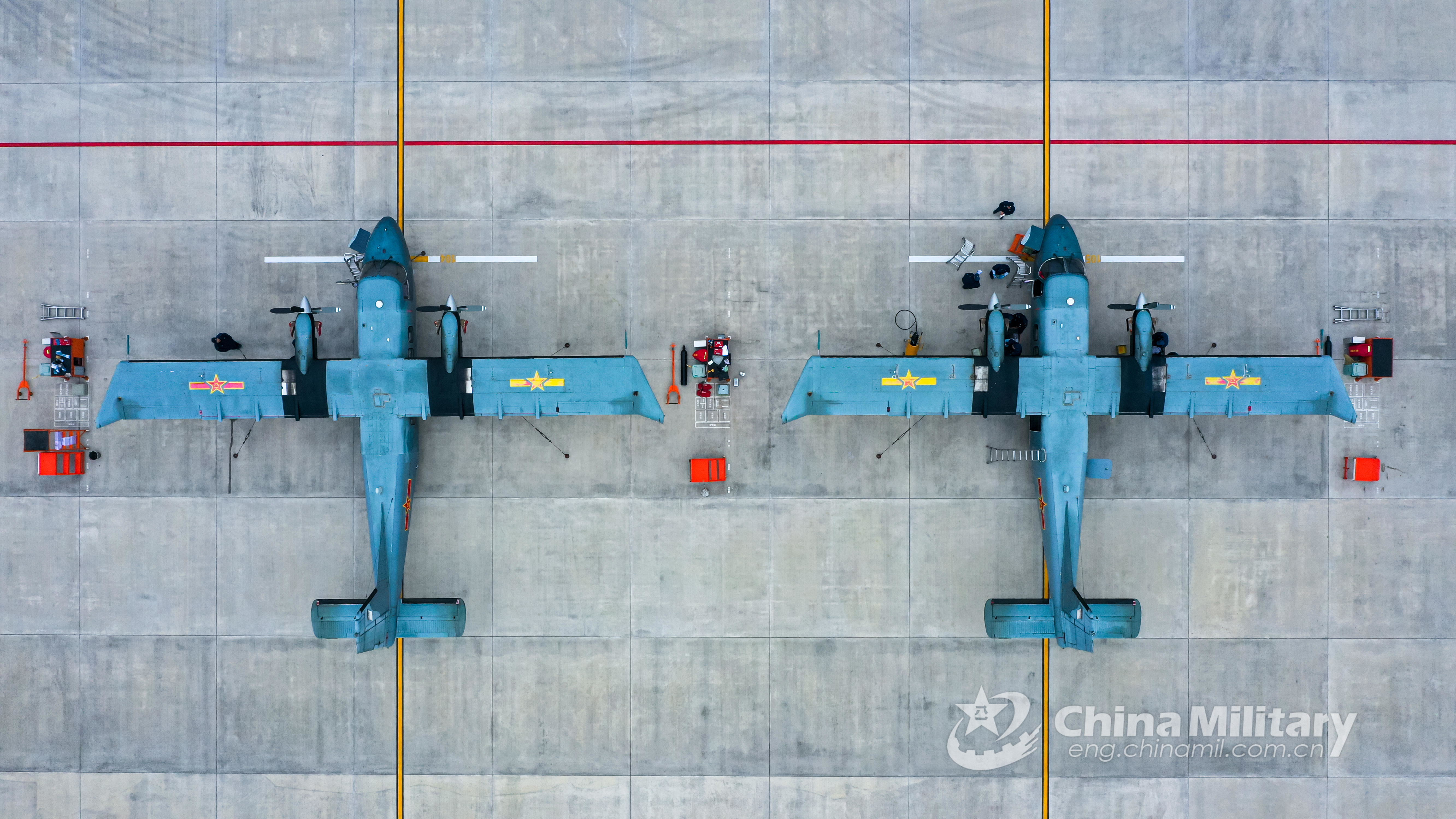 Ground crew members assigned to an air transport brigade under the PLA airborne troop s check and maintain two Y-12 transport aircraft before the high-intensity and day-and-night flight training on January 18, 2022. (eng.chinamil.com.cn/Photo by Li Zhuojun)
