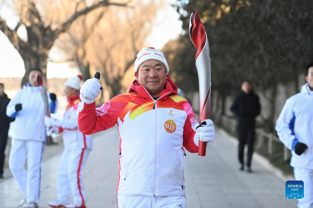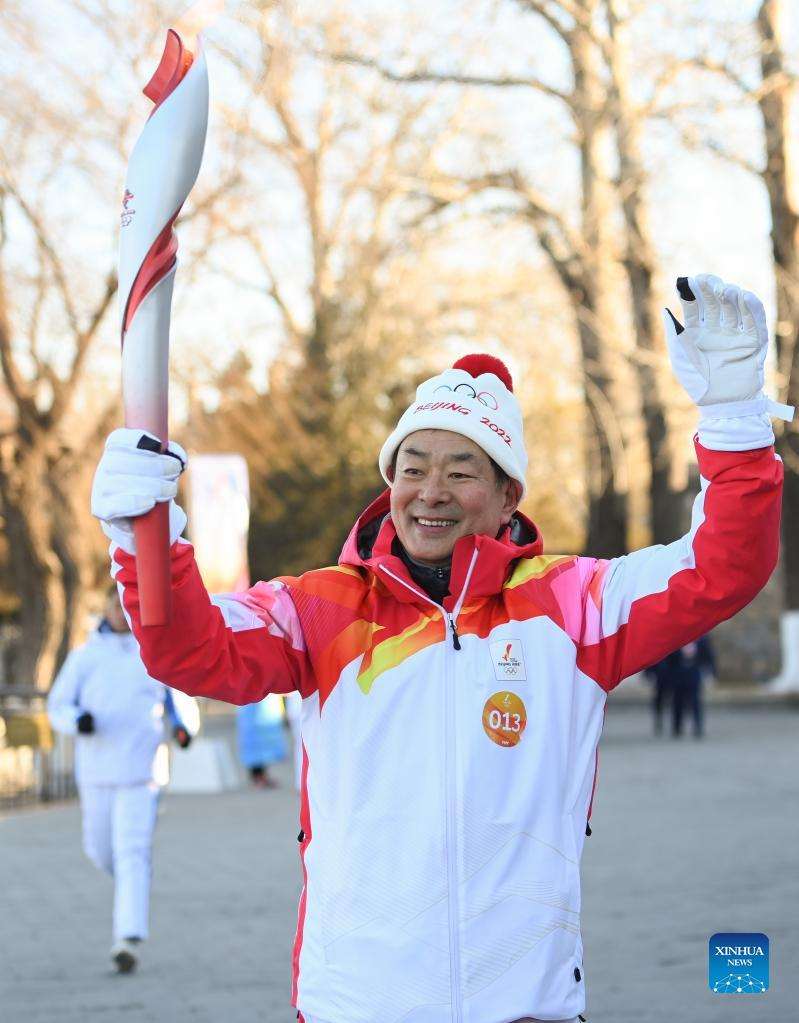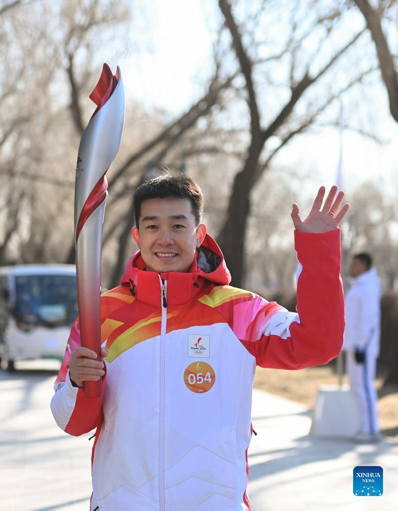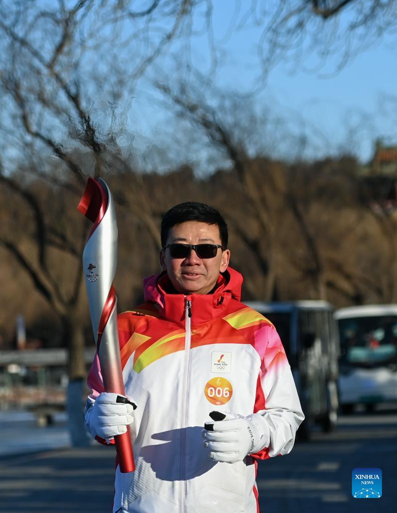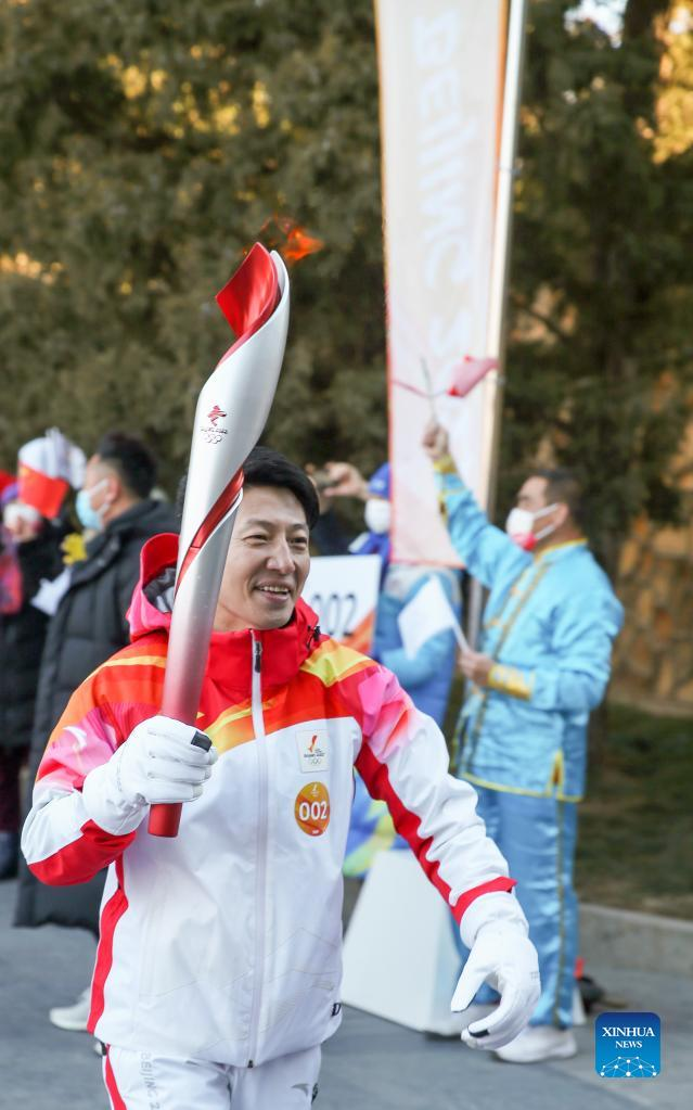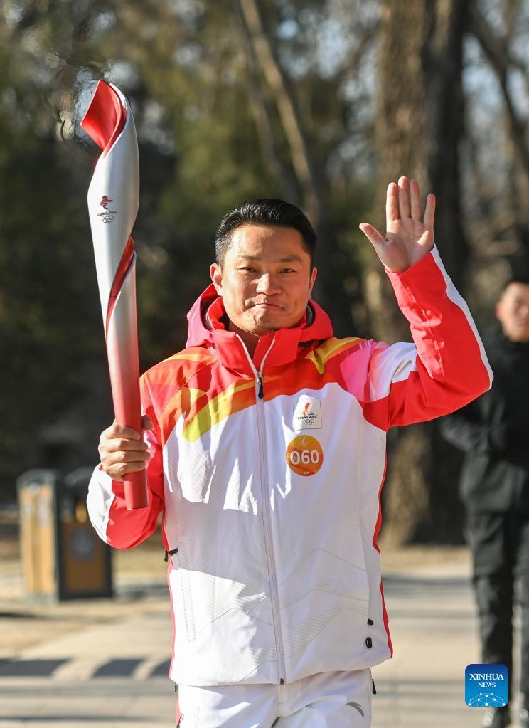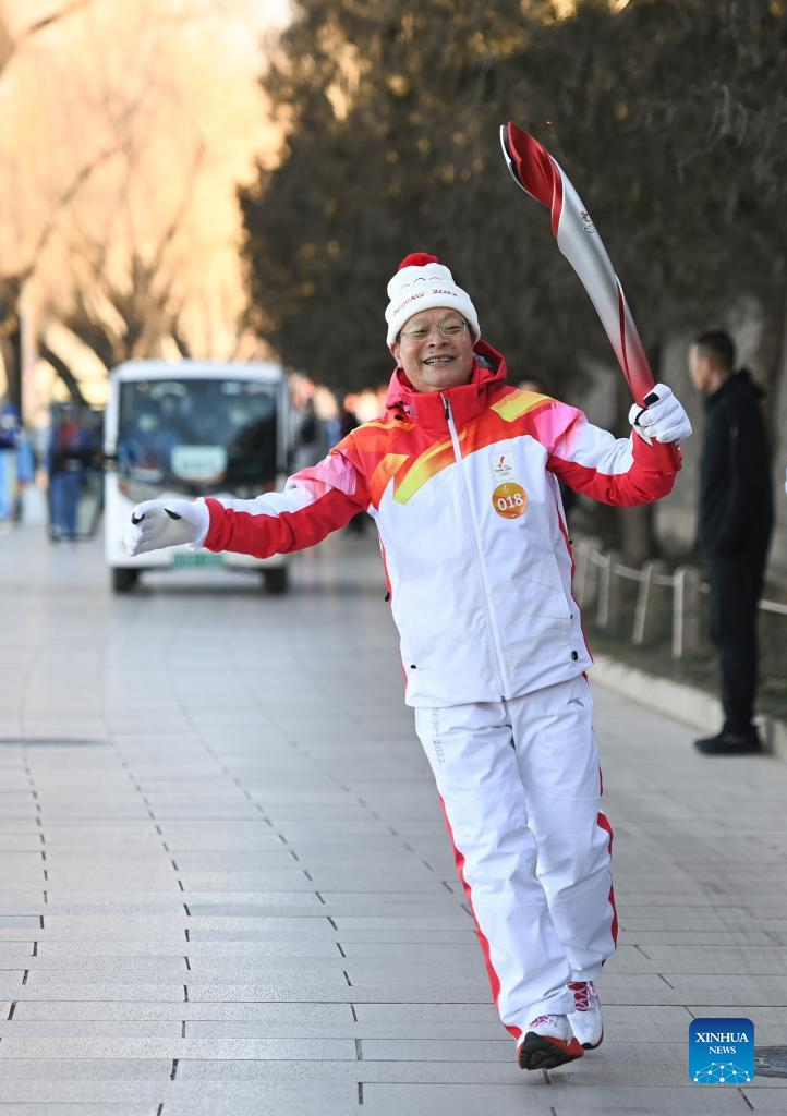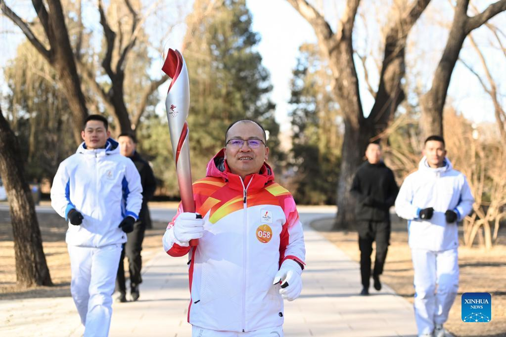 Torch bearer Lyu Chunlong runs with the torch during the Beijing 2022 Olympic Torch Relay at the Summer Palace in Beijing, capital of China, Feb. 4, 2022. (Xinhua/Chen Yehua)