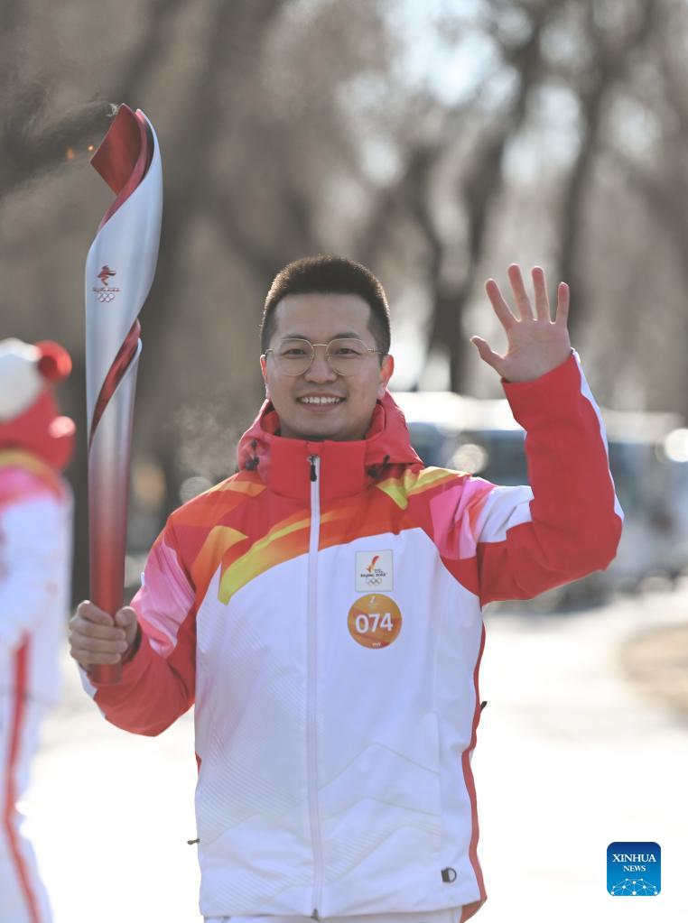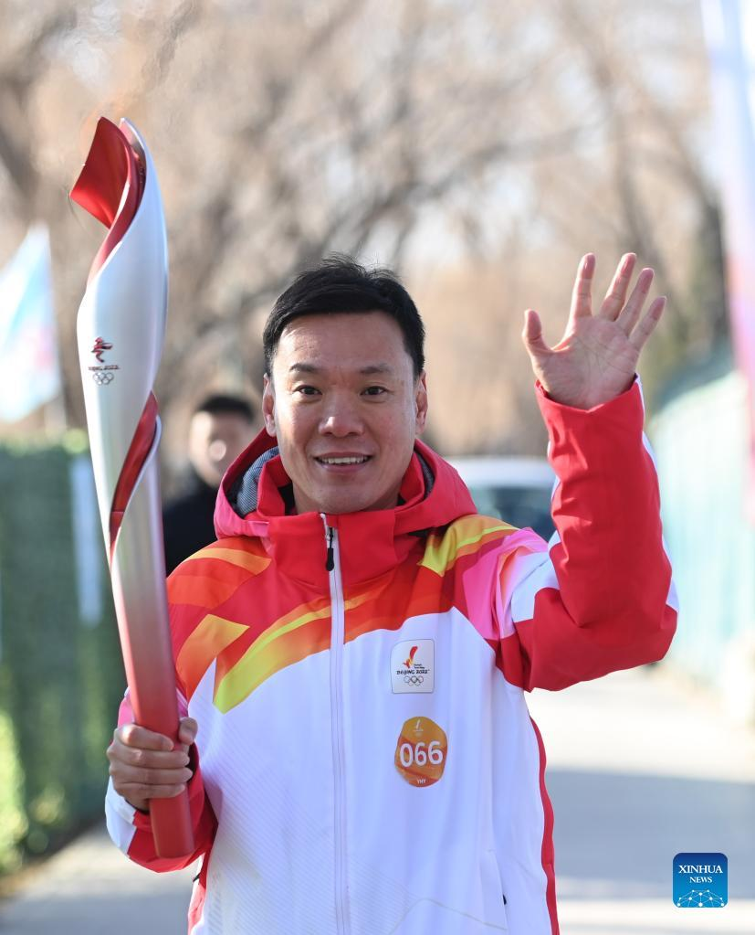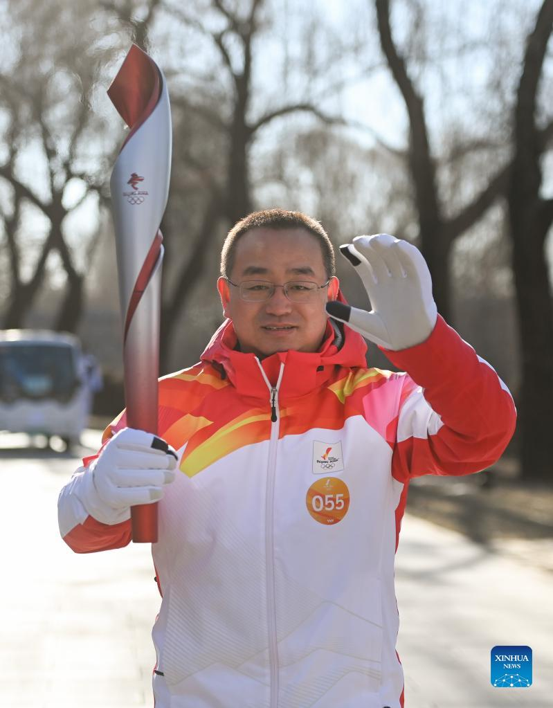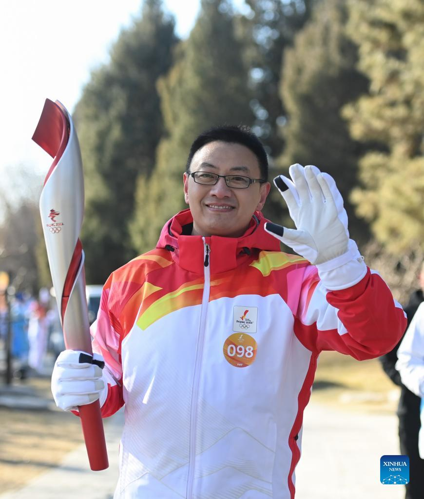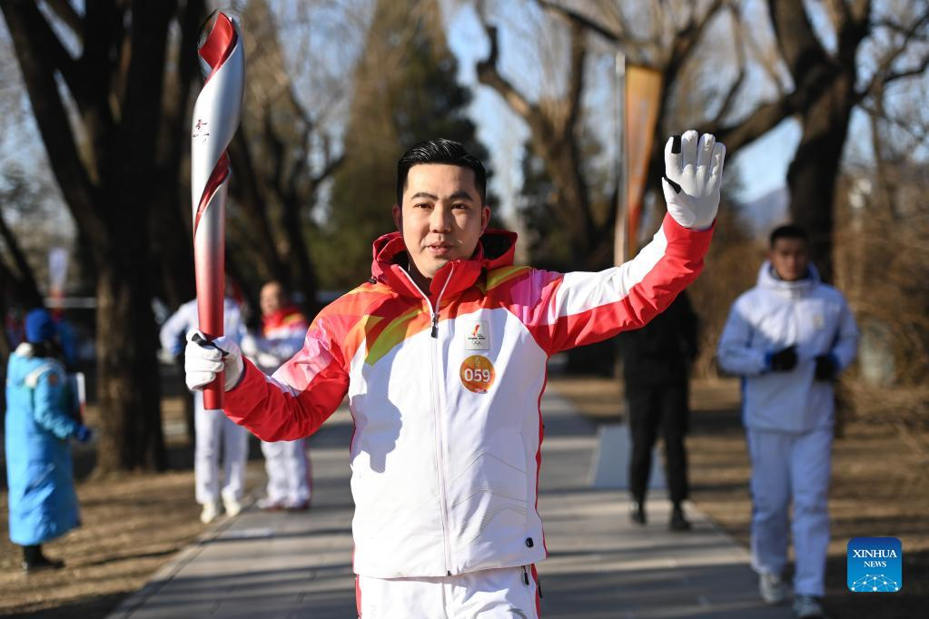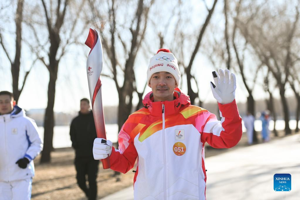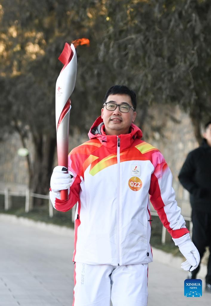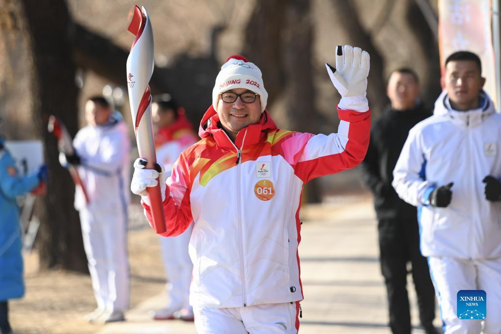 Torch bearer Lyu Chunlong runs with the torch during the Beijing 2022 Olympic Torch Relay at the Summer Palace in Beijing, capital of China, Feb. 4, 2022. (Xinhua/Chen Yehua)