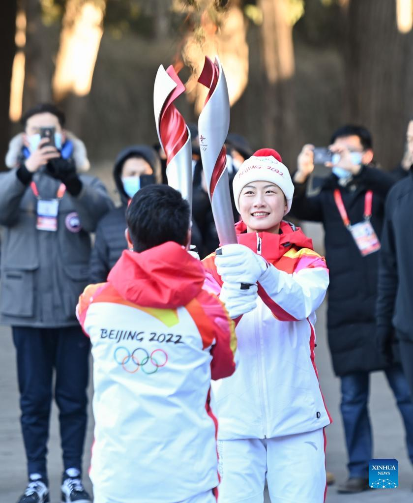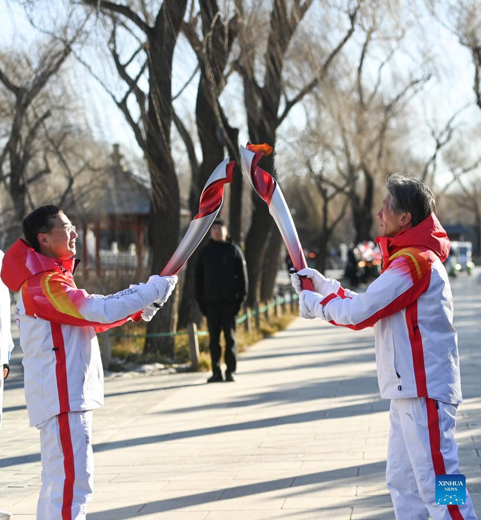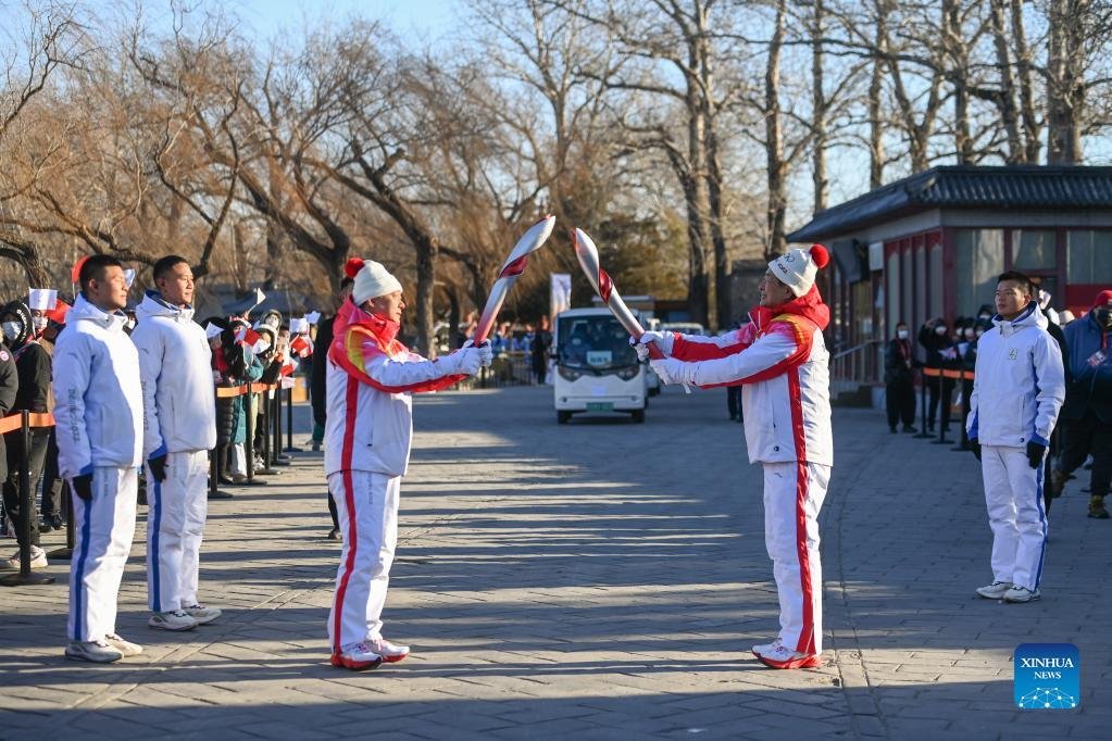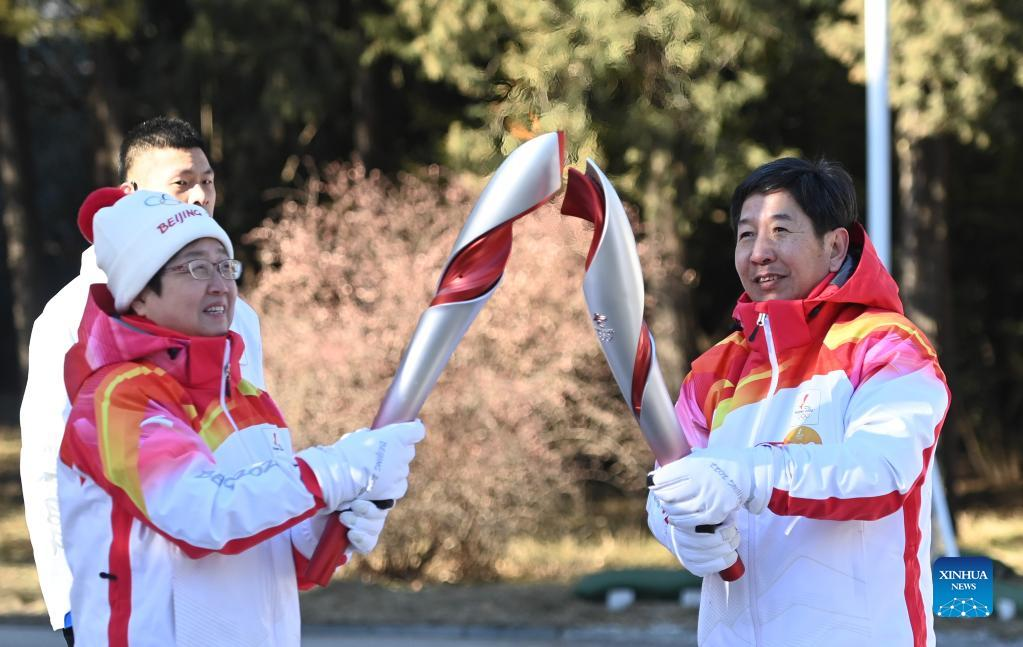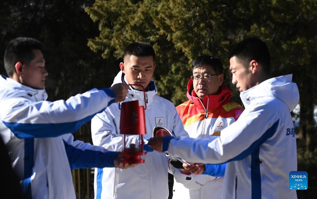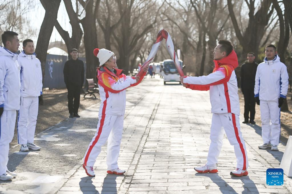 Torch bearer Zheng He (2nd R) hands off the flame to staff members during the Beijing 2022 Olympic Torch Relay at the Summer Palace in Beijing, Feb. 4, 2022. (Xinhua/Chen Yehua)