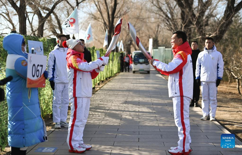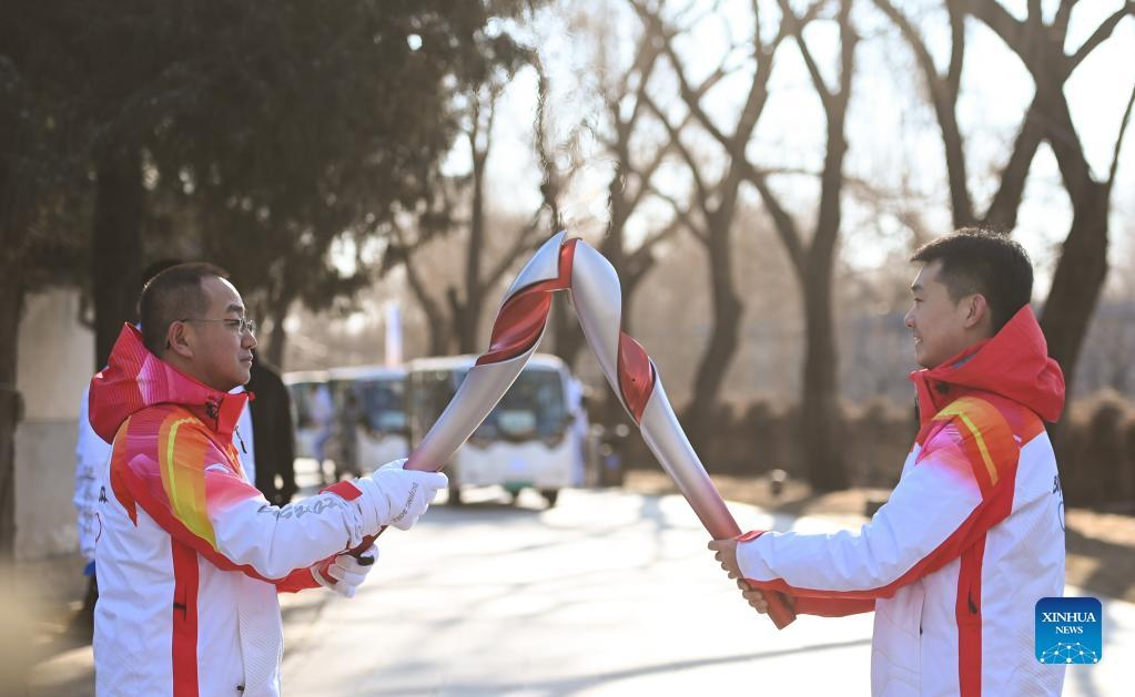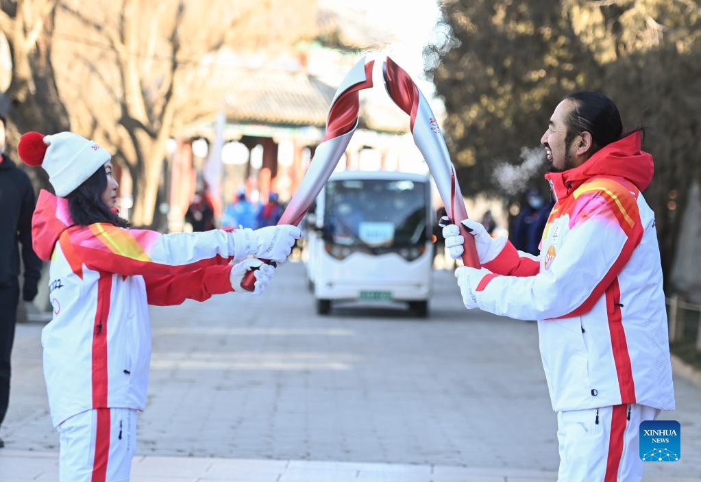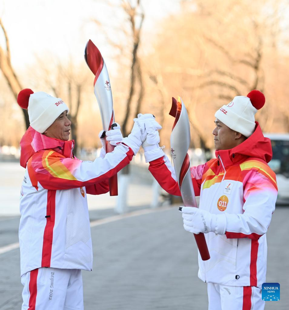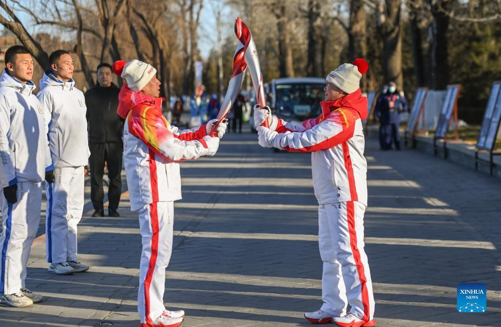 Torch bearer Zheng He (2nd R) hands off the flame to staff members during the Beijing 2022 Olympic Torch Relay at the Summer Palace in Beijing, Feb. 4, 2022. (Xinhua/Chen Yehua)