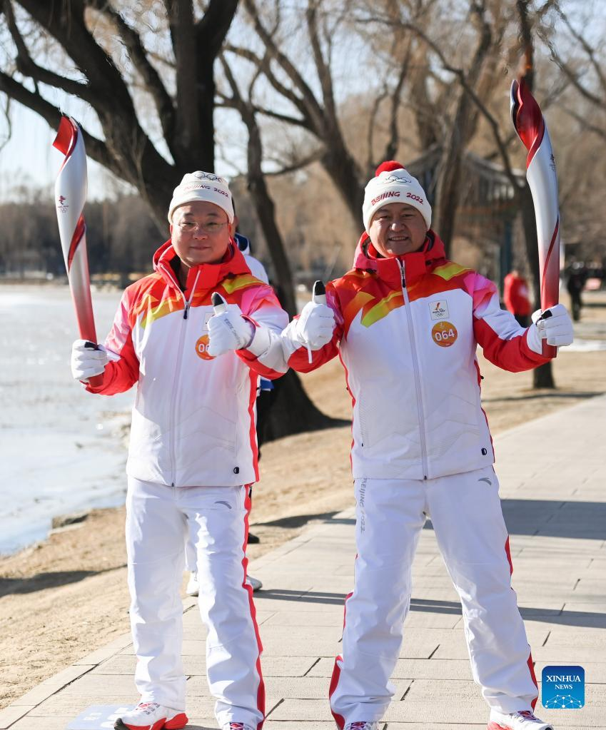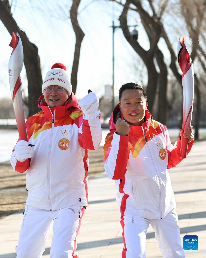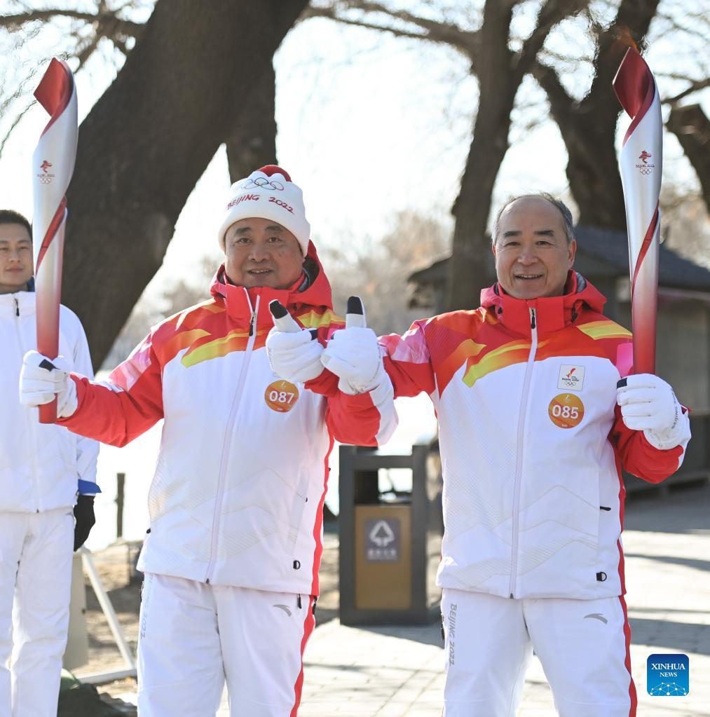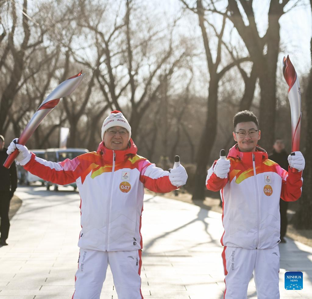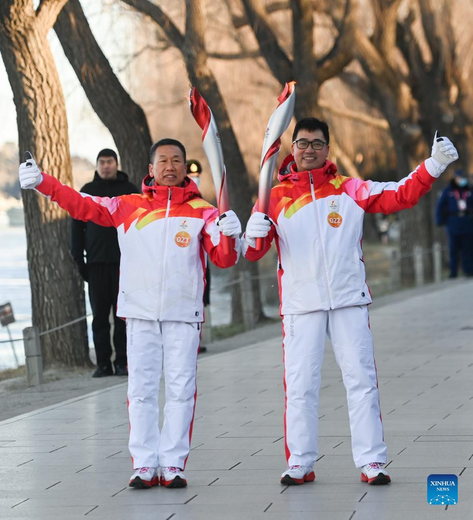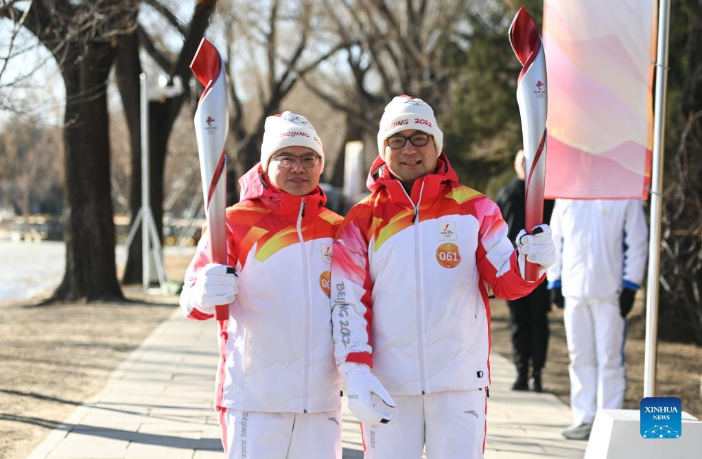 Torch bearer Liu Kejing (R front) and Liu Xiaochang attend the Beijing 2022 Olympic Torch Relay at Summer Palace in Beijing, capital of China, Feb. 4, 2022. (Xinhua/Chen Yehua)