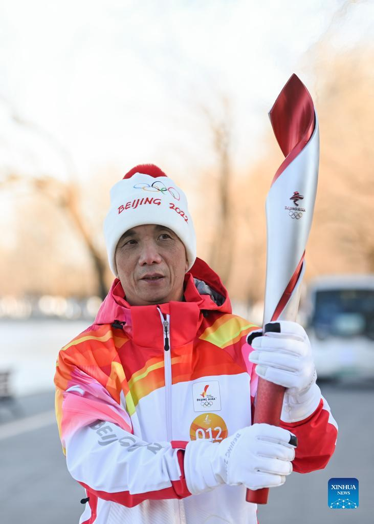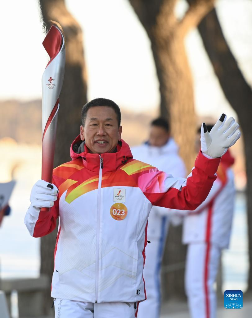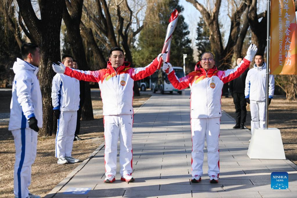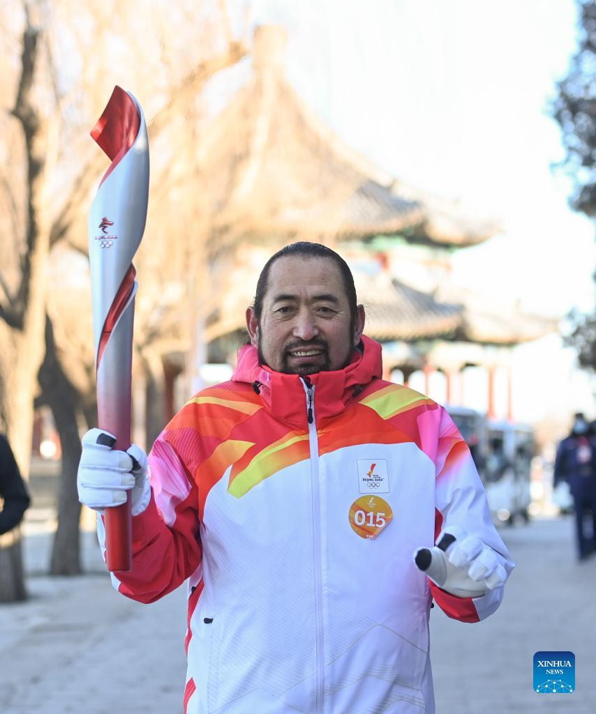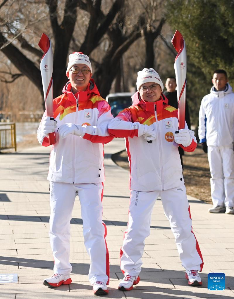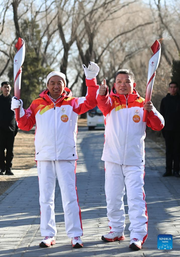 Torch bearer Liu Kejing (R front) and Liu Xiaochang attend the Beijing 2022 Olympic Torch Relay at Summer Palace in Beijing, capital of China, Feb. 4, 2022. (Xinhua/Chen Yehua)