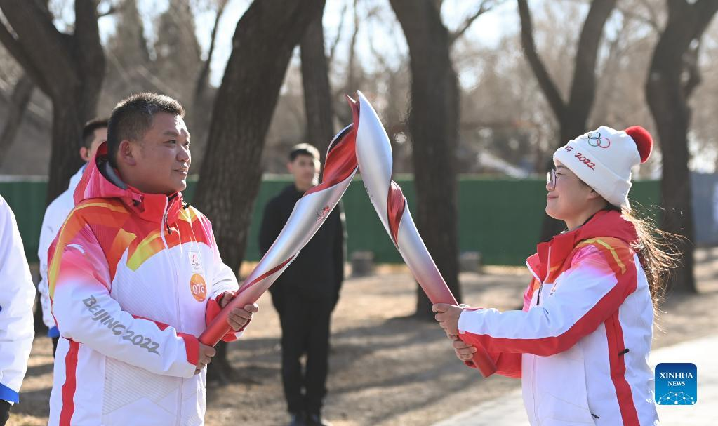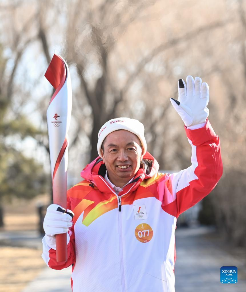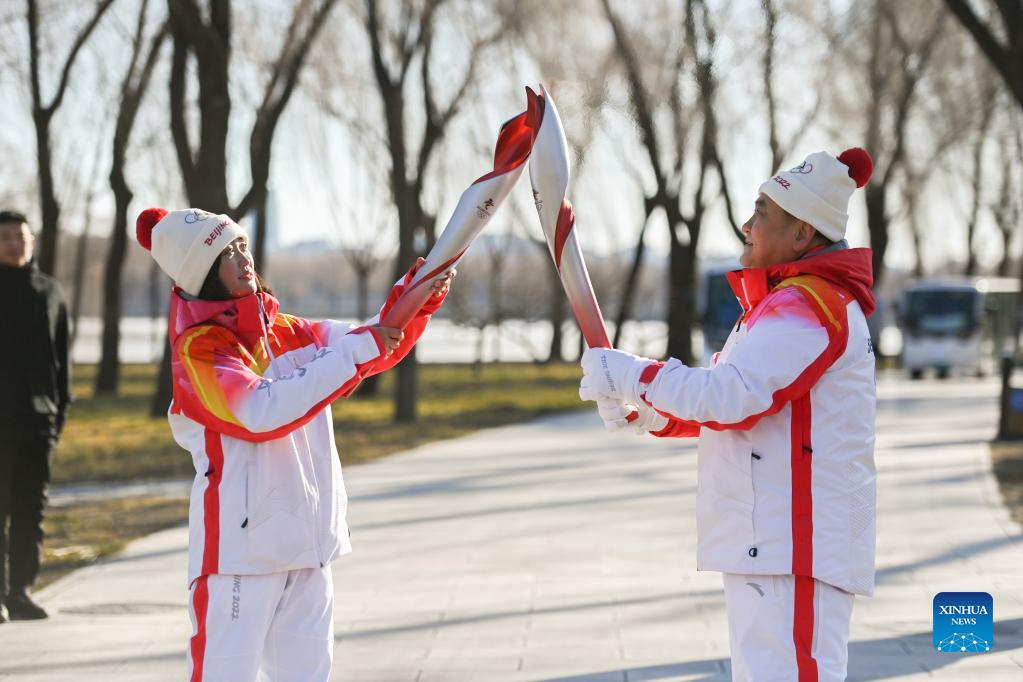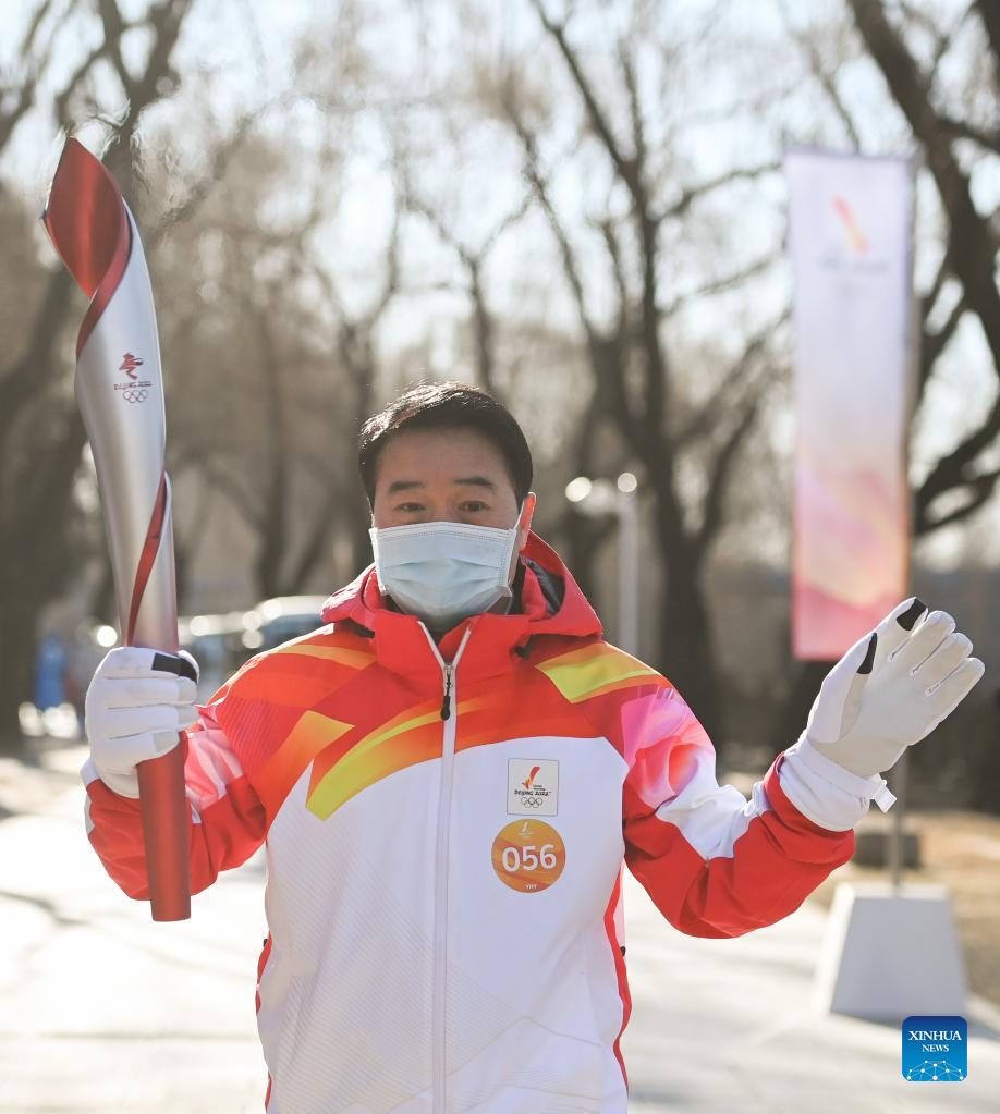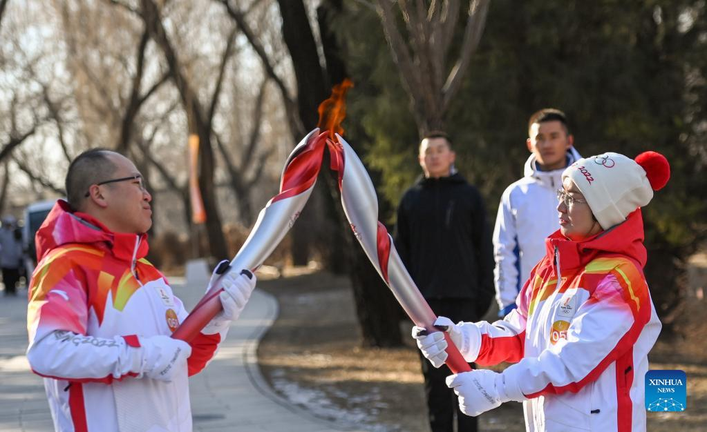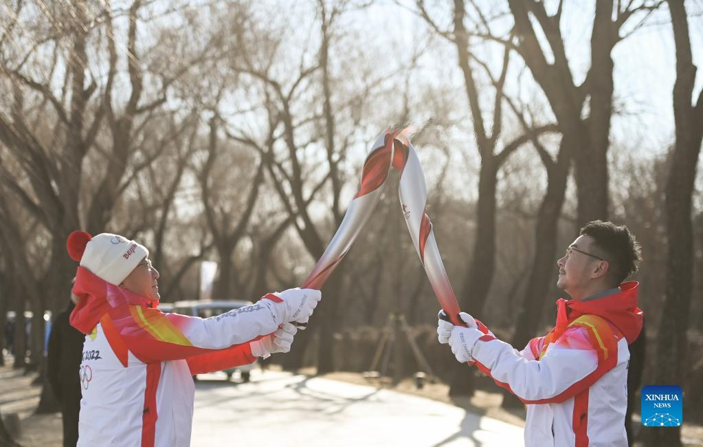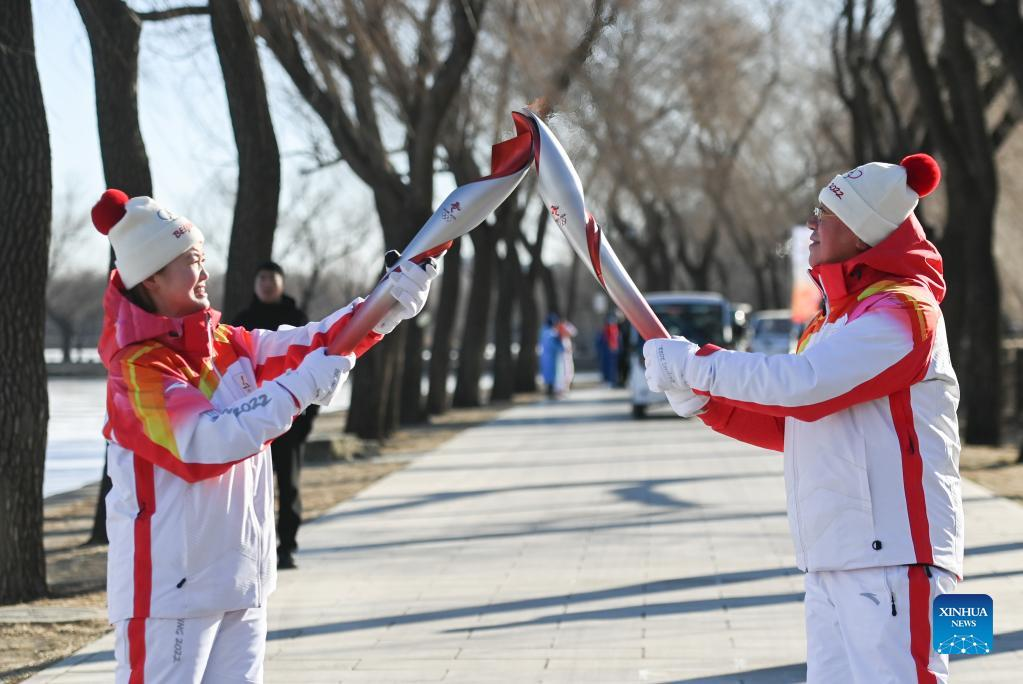 Torch bearer Liu Kejing (R front) and Liu Xiaochang attend the Beijing 2022 Olympic Torch Relay at Summer Palace in Beijing, capital of China, Feb. 4, 2022. (Xinhua/Chen Yehua)